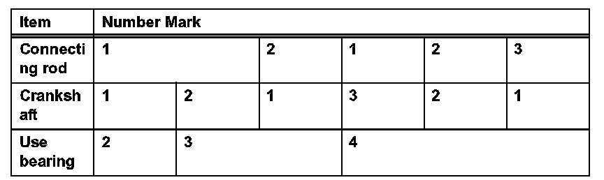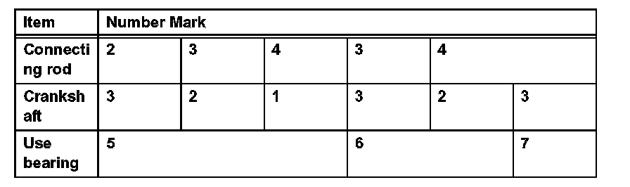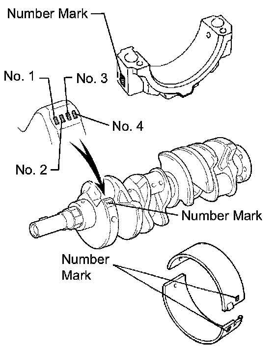 HINT: If replacing a standard bearing, replace it with one that has the same number. If the number of the bearing cannot be determined, select the correct bearing by adding together the numbers imprinted on the connecting rod cap and crankshaft, and then select the bearing with the same number as the total. There are 6 sizes of standard bearings, marked 2, 3, 4, 5, 6 and 7.