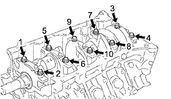 k. Install and uniformly tighten the 10 crankshaft bearing cap bolts in several steps, in the order shown in the illustration.