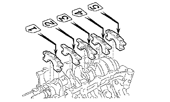 HINT: Be sure to arrange the bearing caps, bearings and thrust washers in such a way that they can be reinstalled exactly as before.