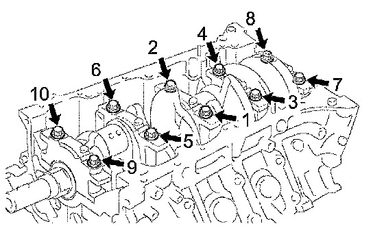 m. Retighten the crankshaft bearing cap bolts by 90° in the order shown above.