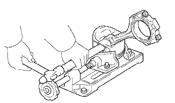 f. Using a plastic-faced hammer and brass bar, lightly tap out the piston and pin. Then remove the connecting rod.