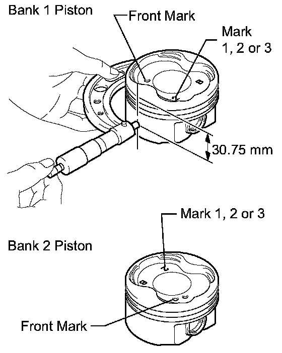 1 Using a micrometer, measure the piston diameter at right angles to the piston pin center line, 30.75 mm (1.2106 inch) from the piston head.