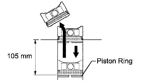 2 Using a piston, push the piston ring a little beyond the bottom of the ring travel, 105 mm (4.13 inch) from the top of the cylinder block.