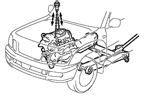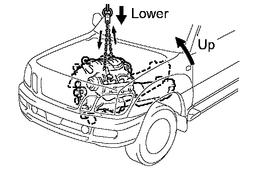 b. Slowly lower the engine and the transmission assembly into the engine compartment.