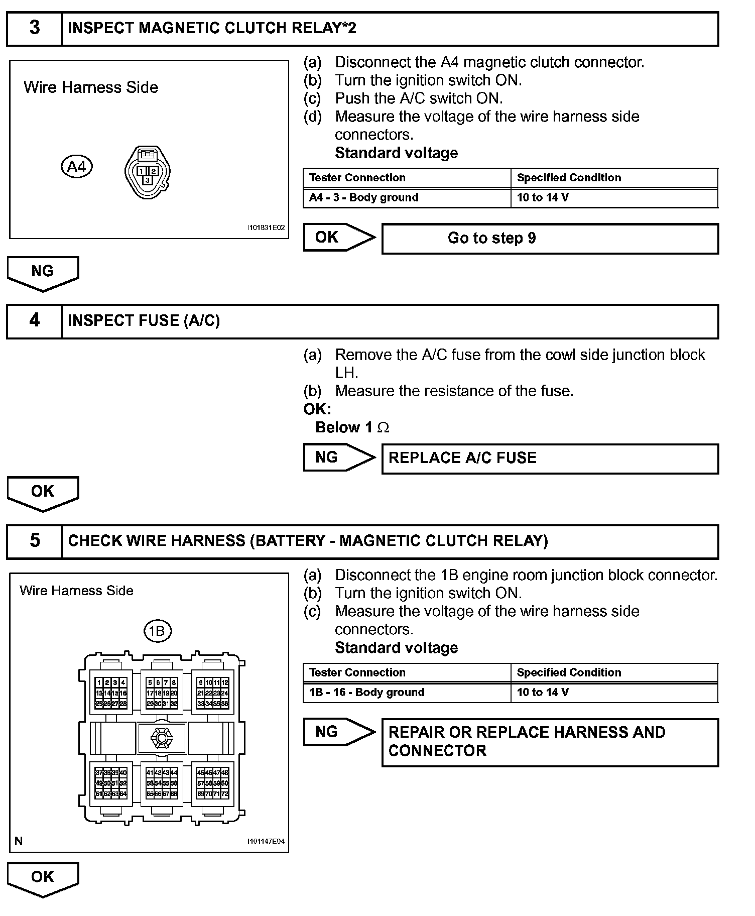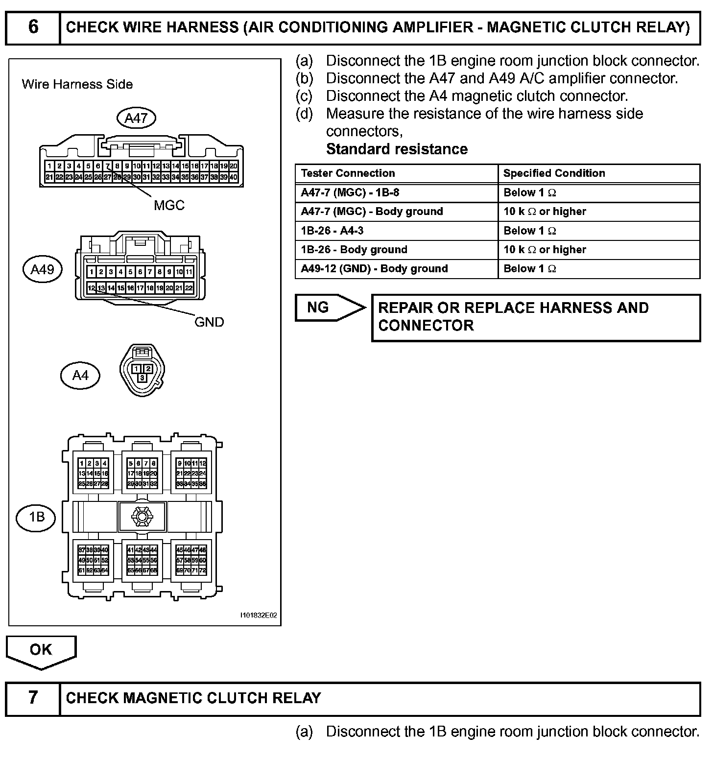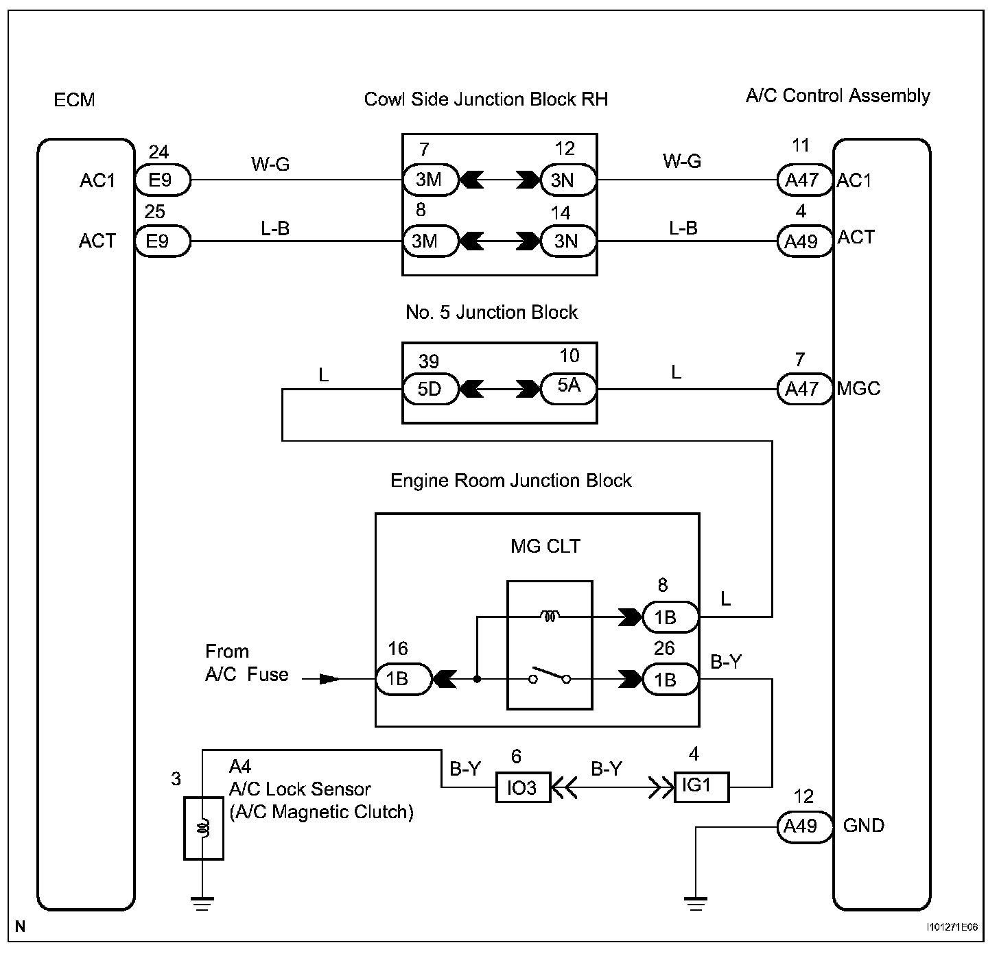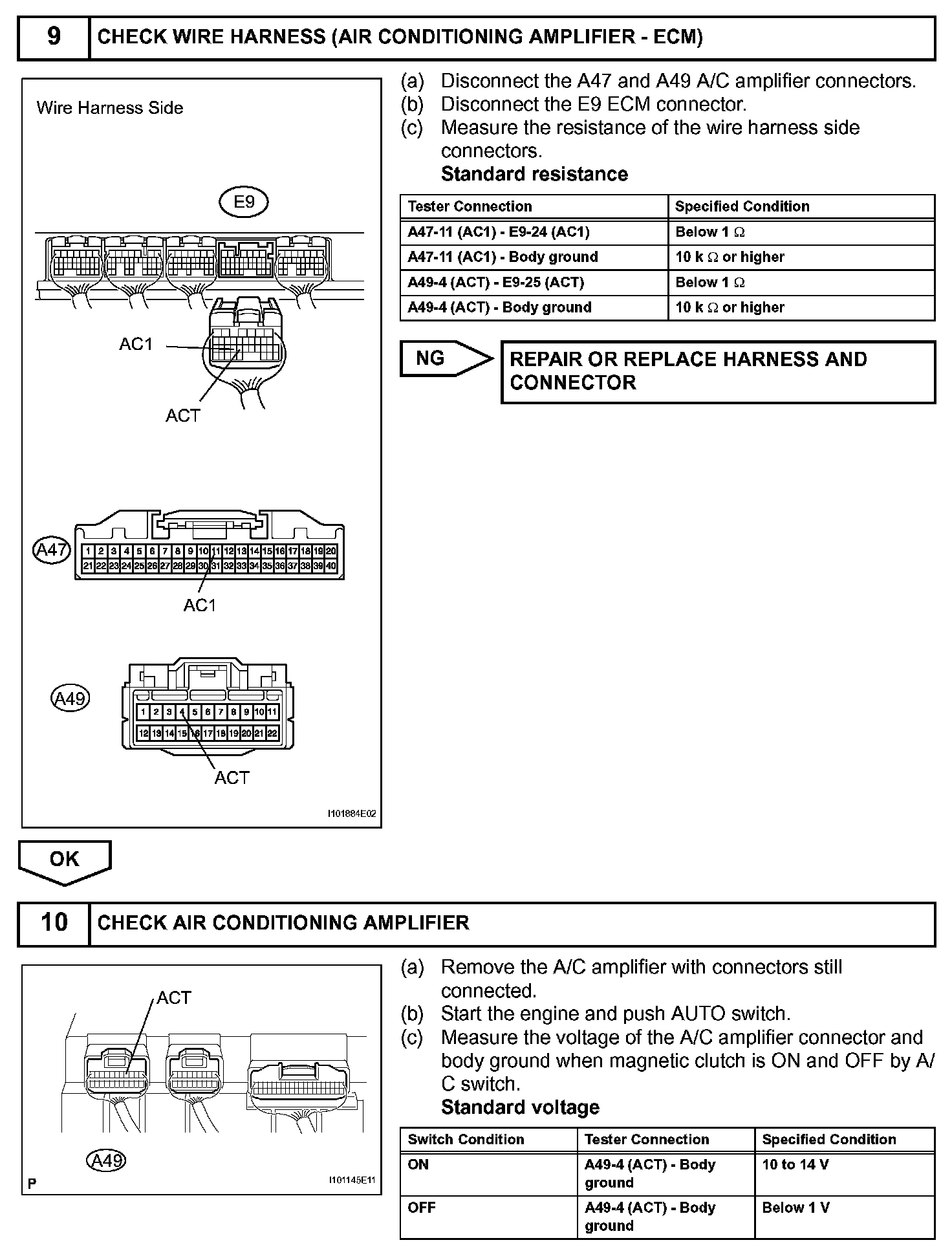 The A/C amplifier outputs the magnetic clutch ON signal from terminal ACT to the ECM. When the ECM receives this signal, it sends a signal from terminal MGC and switches the A/C magnetic clutch relay ON, thus turning on the A/C magnetic clutch.