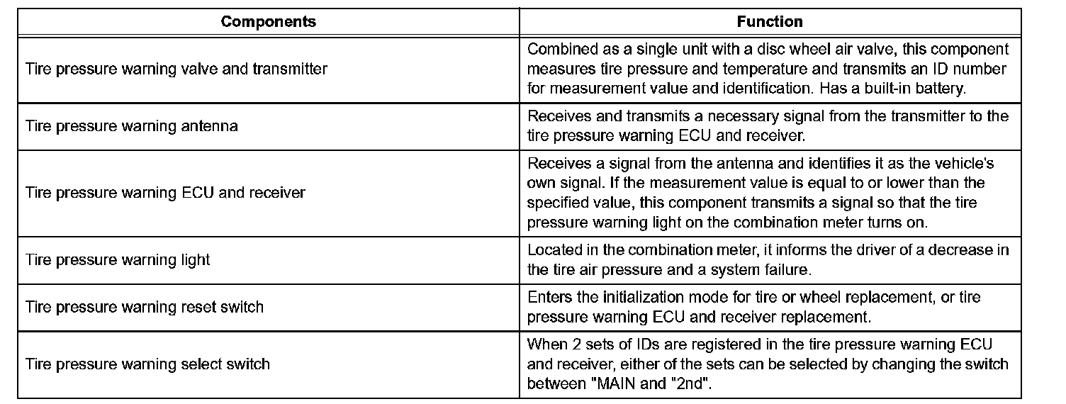 ^ During initialization, the tire pressure warning valve and transmitter measures the inflation pressure of the tires, and registers the signals that are transmitted into the tire pressure warning ECU and receiver at a frequency of one per minute. The initialization process is completed when the signals from all tires (including the spare tire) have been received.