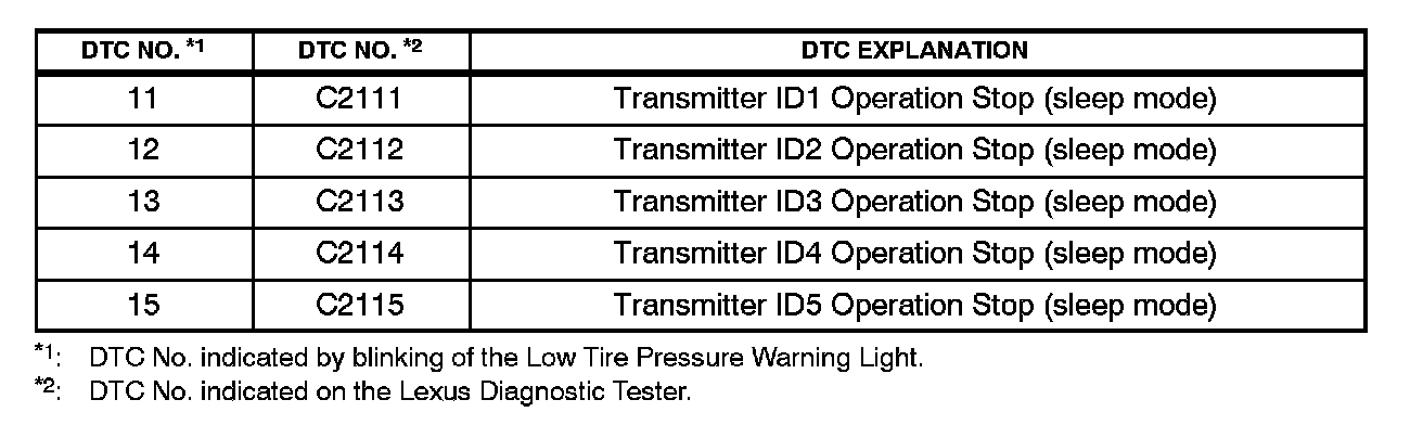 ^ The Diagnostic Trouble Codes (DTCs) listed below may be stored in the TPWS ECU until the tire pressure warning valves/sensors are activated.