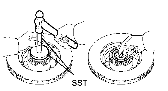 a. Using SST and a hammer, tap in a new oil seal into the axle hub.