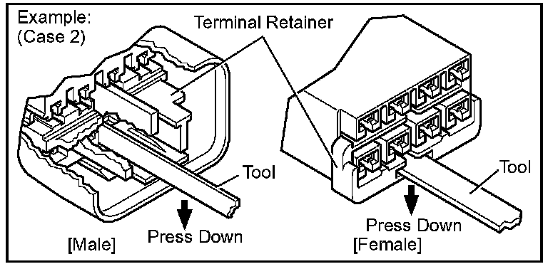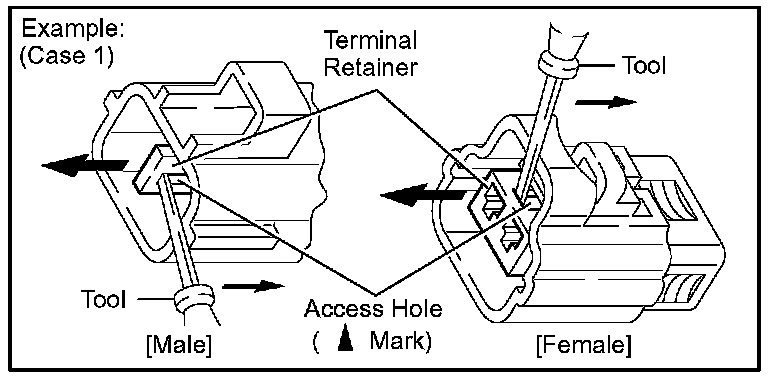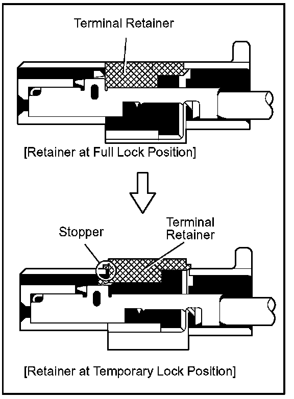 Insert the special tool into the terminal retainer access hole ( Mark) and pull the terminal retainer up to the temporary lock position.