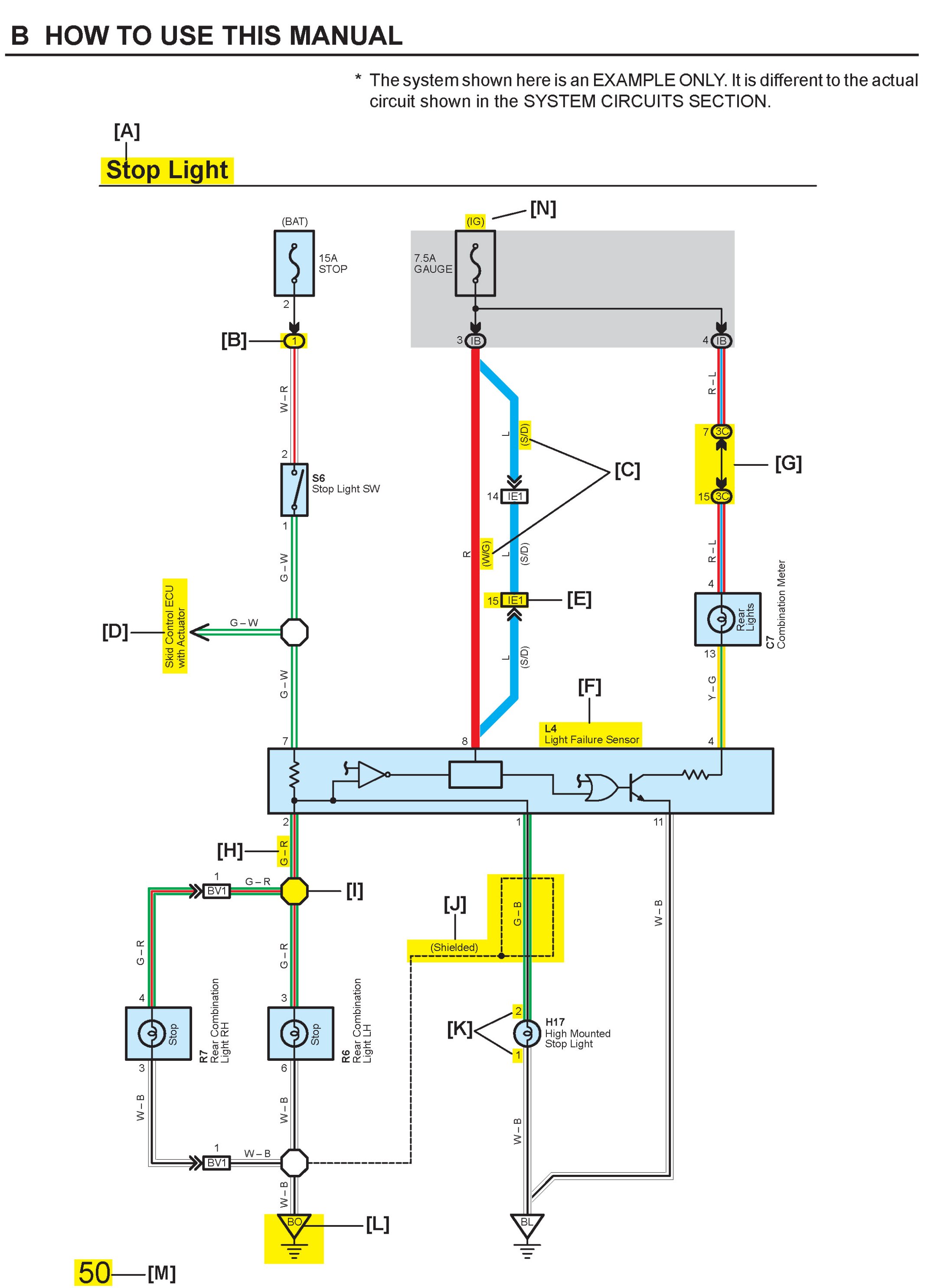 Current is applied at all times through the STOP fuse to TERMINAL 2 of the stop light SW.