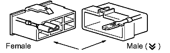 [E]: Indicates the wiring harness and wiring harness connector. The wiring harness with male terminal is shown with arrows ( ).