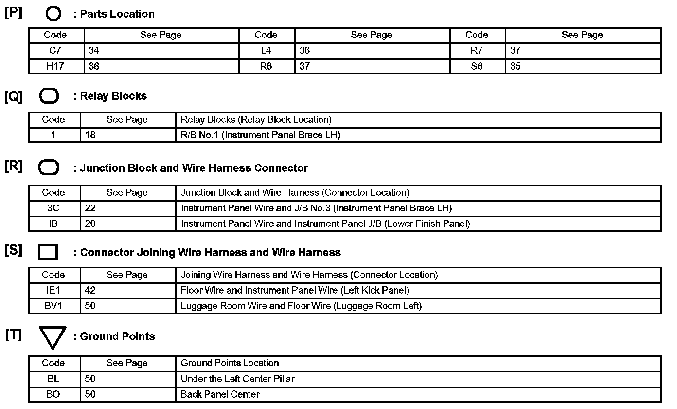The first letter of the code for each ground point(s) indicates the component's location, e.g, "E" for the Engine Compartment, "I" for the Instrument Panel and Surrounding area, and "B" for the Body and Surrounding area.