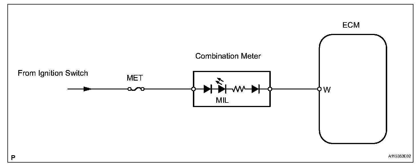 The Malfunction Indicator Lamp (MIL) is used to indicate the ECM's detection of a vehicle malfunction. The instrument panel MET fuse provides the circuit with power and the ECM provides the circuit ground that illuminates the MIL.