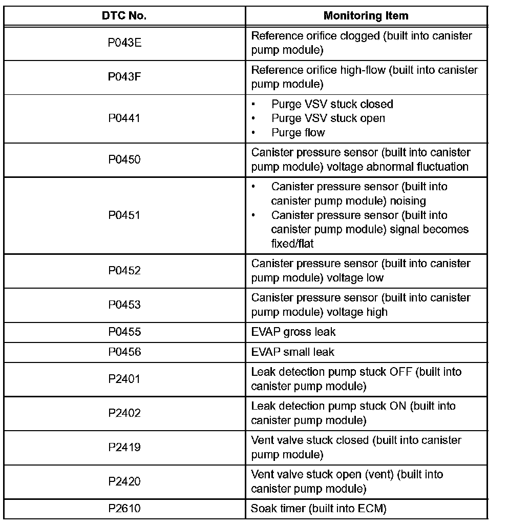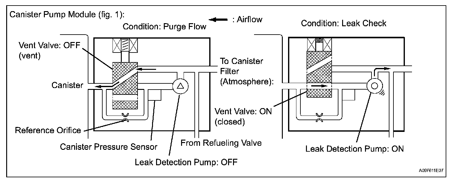 The leak detection pump creates negative pressure (vacuum) in the EVAP system and the pressure is measured. Finally, the ECM monitors for leaks from the EVAP system and malfunctions in both the canister pump module and purge VSV, based on the EVAP pressure.