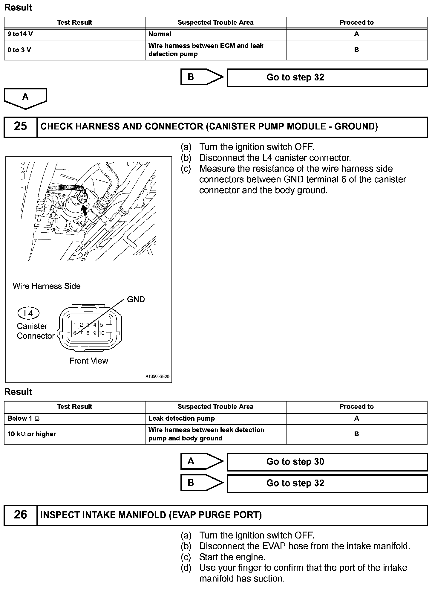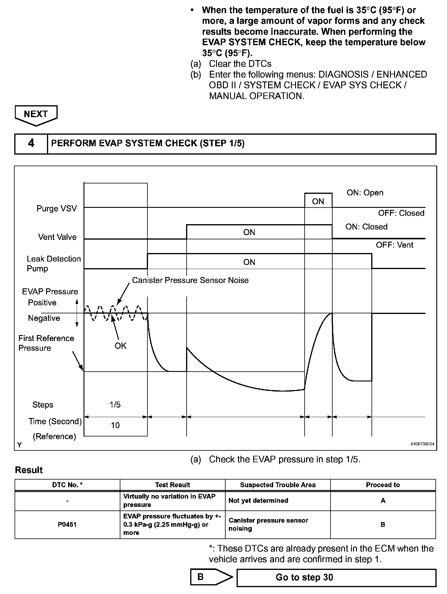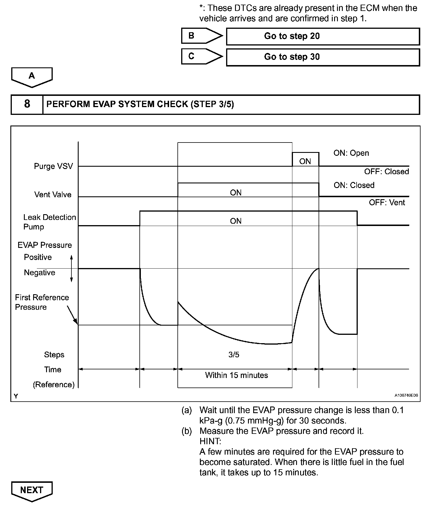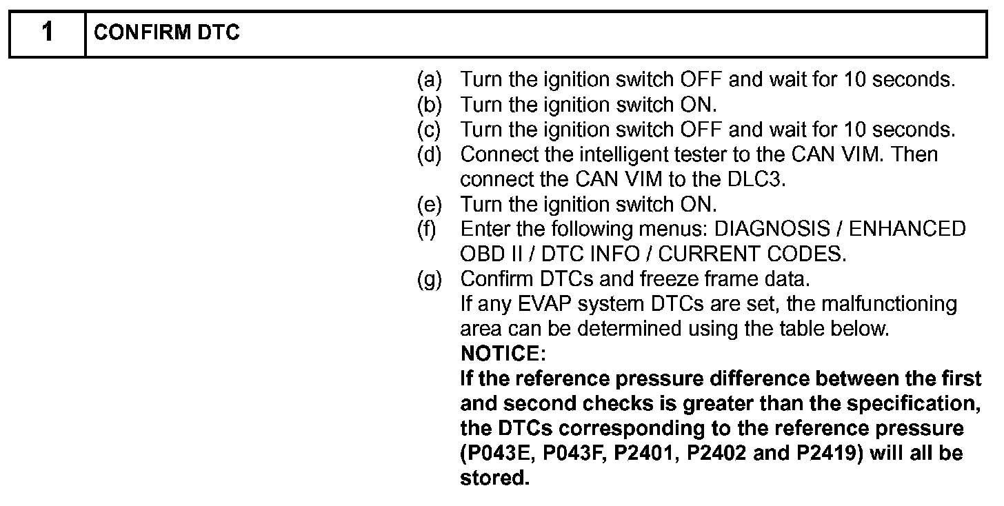 NOTE: If the reference pressure difference between the first and second checks is greater than the specification, the DTCs corresponding to the reference pressure (P043E, P043F, P2401, P2402 and P2419) will all be stored.
