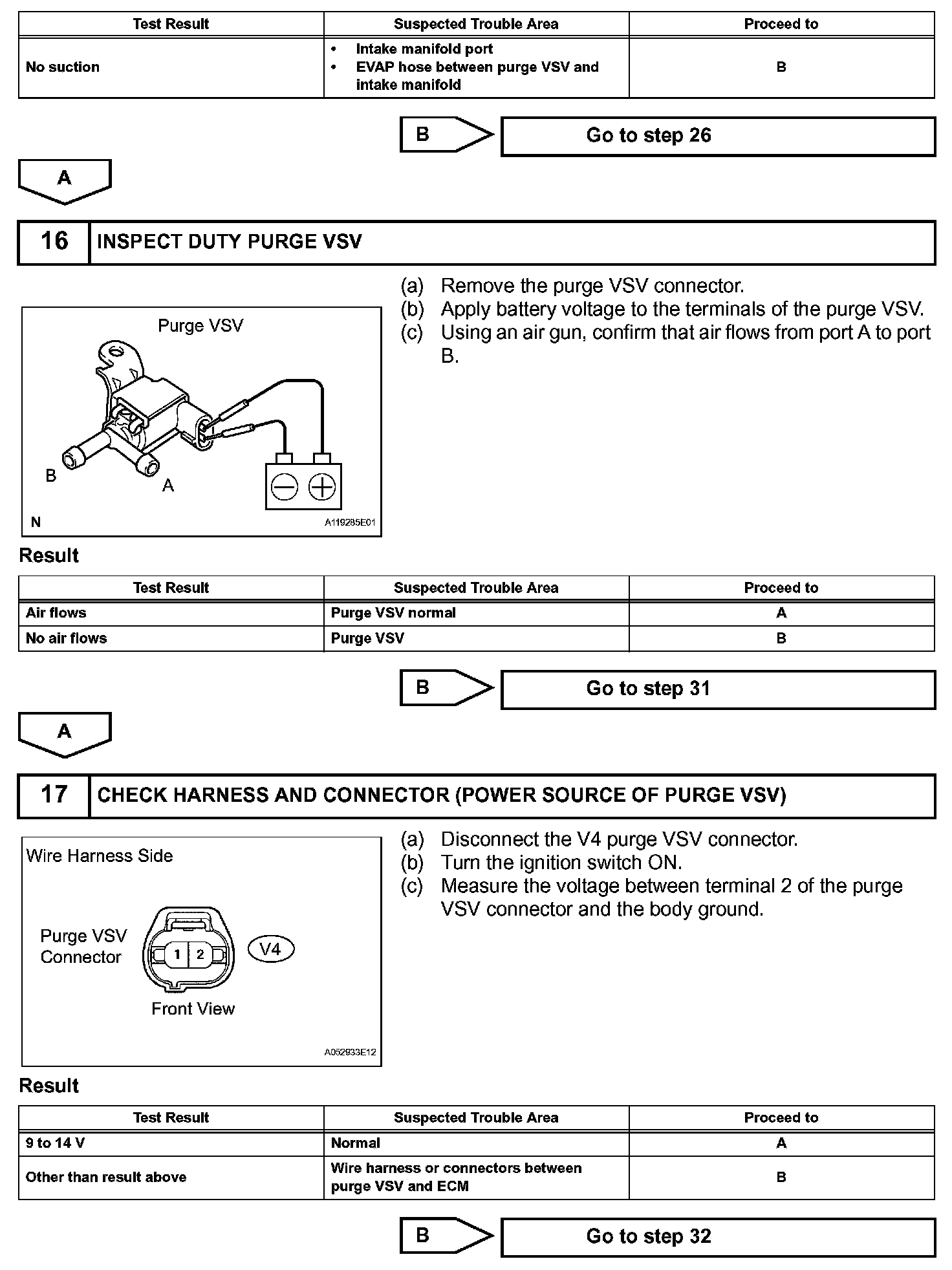 While the engine is running, if a predetermined condition (closed-loop etc.) is met, the purge VSV is opened by the ECM and stored fuel vapors in the canister are purged to the intake manifold. The ECM changes the duty cycle ratio of the purge VSV to control purge flow volume.