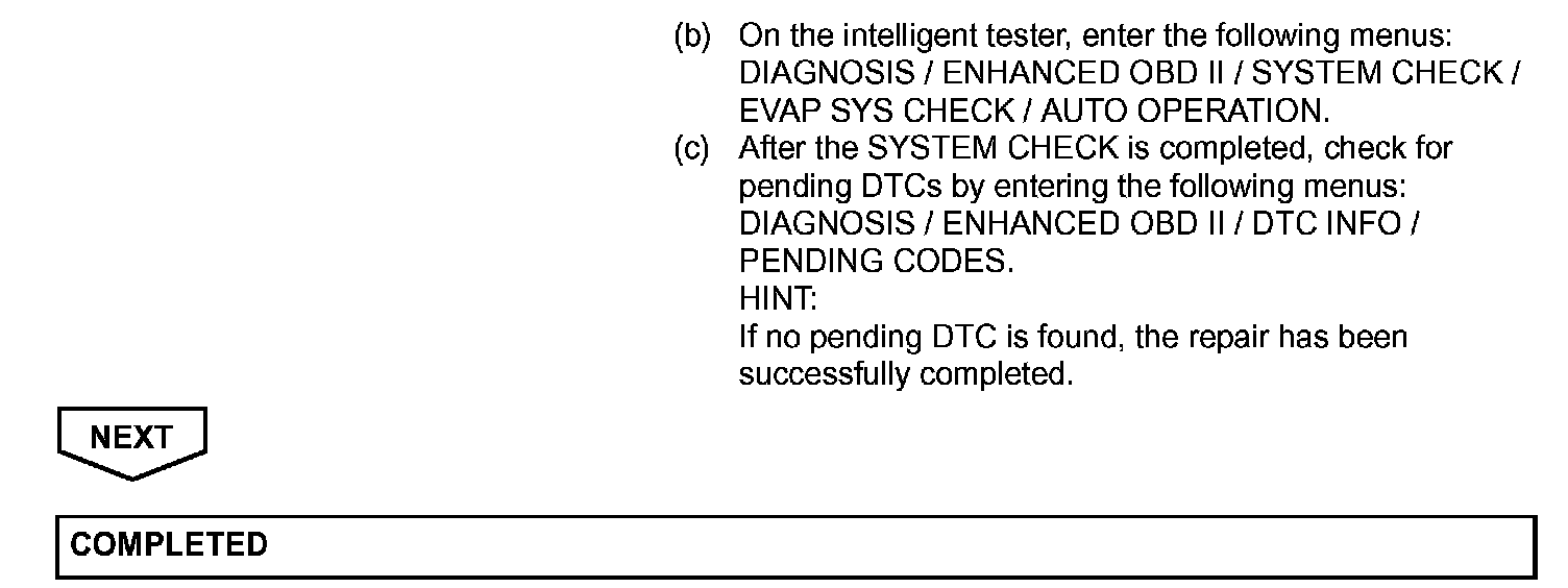 HINT: After a repair, check Monitor Status by performing the key-off monitor confirmation and purge flow monitor confirmation described below.