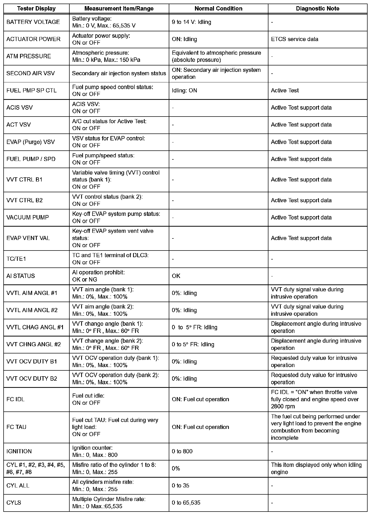 HINT: If no conditions are specifically stated for "idling", the shift lever is in the N or P position, and the A/C switch is OFF and all accessory switches are OFF.