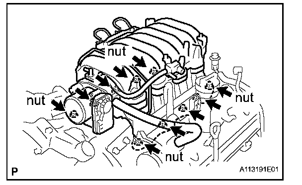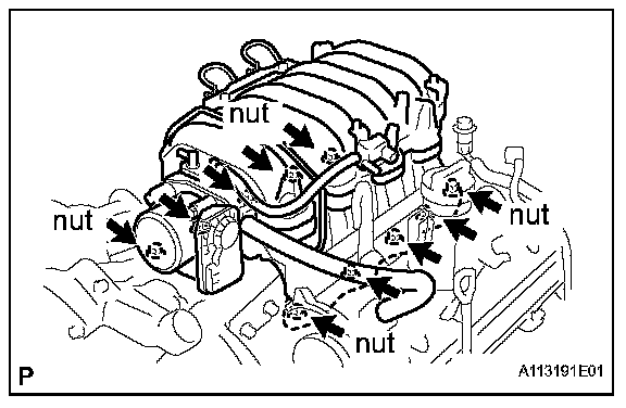 j. Remove the 6 bolts, 4 nuts, intake manifold assembly and 2 gaskets.