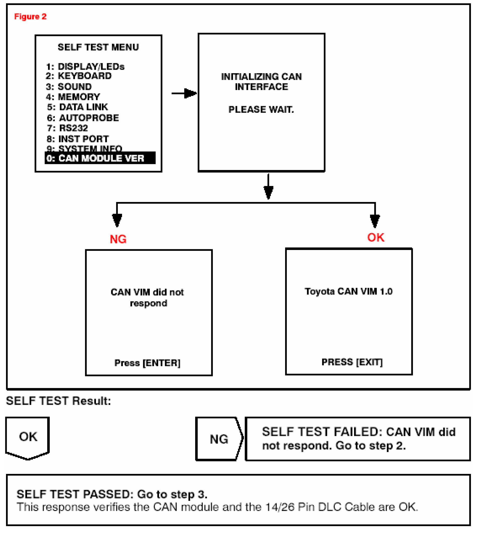 1. Using the Diagnostic Tester, perform the CAN MODULE VERSION self test. Select DIAGNOSIS/SETUP/SELF TEST and perform the following screen flow: