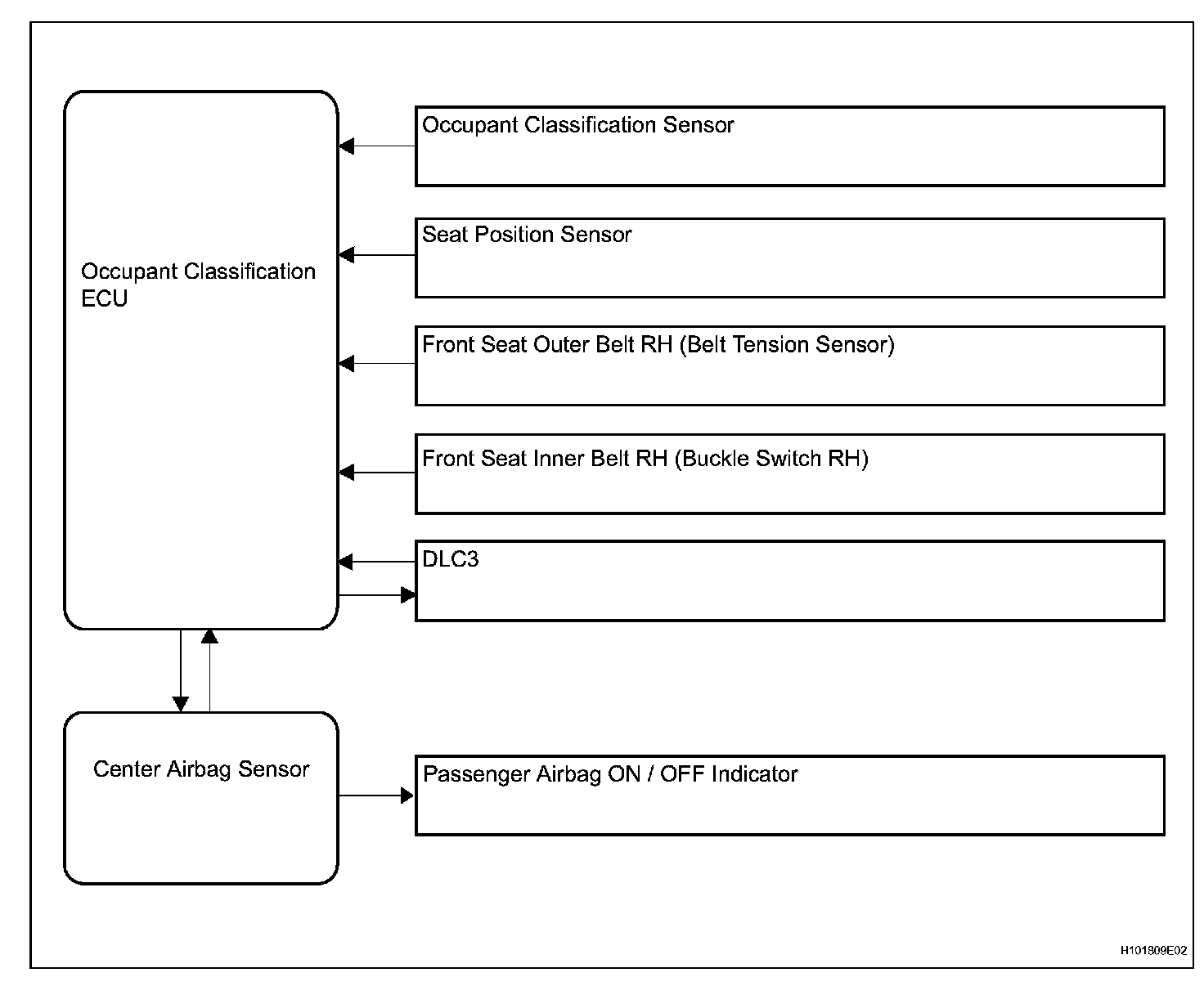b. This system is mainly comprised of the occupant classification sensor that detects the load on the front passenger seat. The occupant classification ECU controls the system, and the passenger airbag ON / OFF indicator indicates the ON / OFF condition of the front passenger airbag and front passenger side - side airbag.