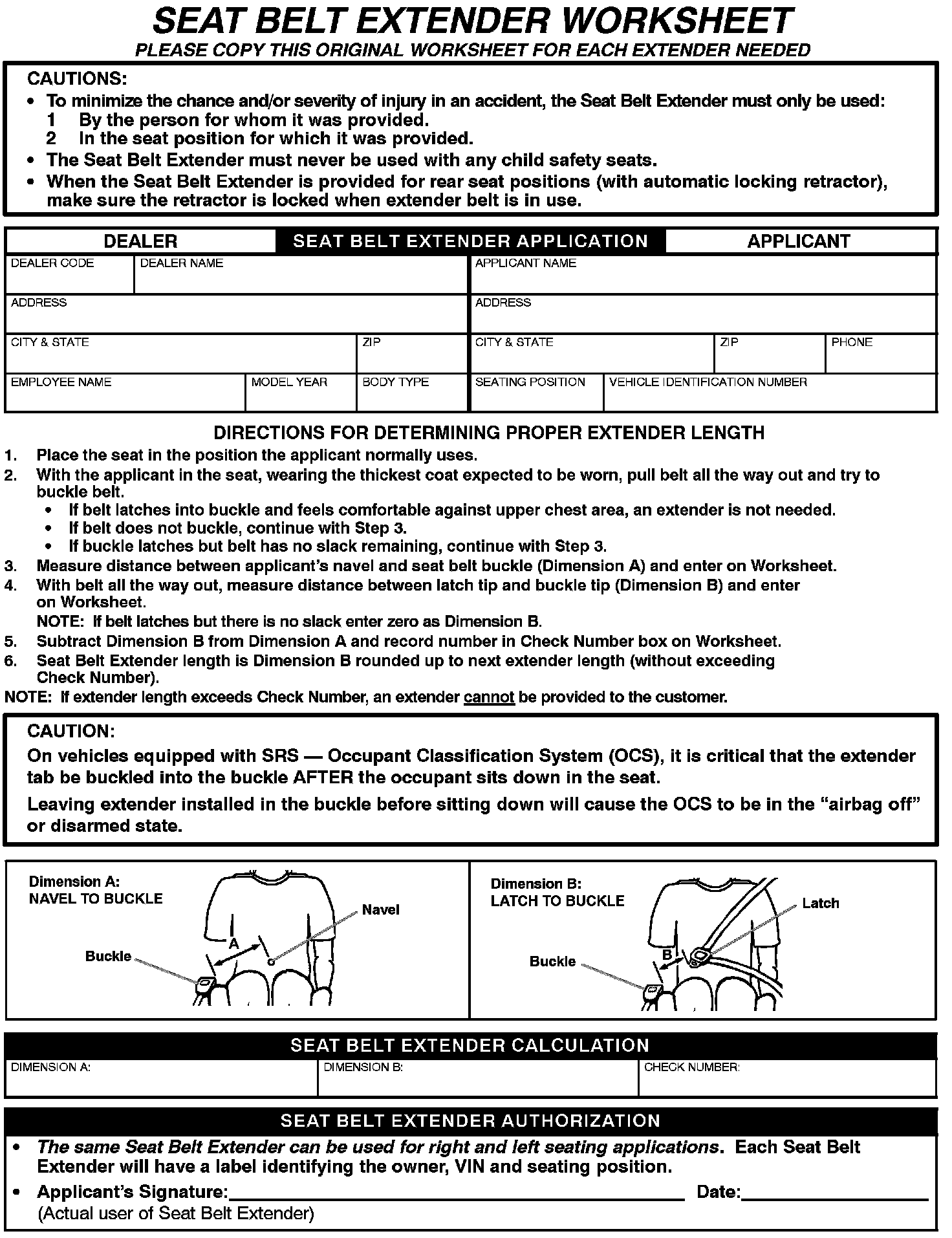 2. Dealer verifies the need for a Seat Belt Extender and obtains a current copy of this TSIB and copies the Worksheet as shown.