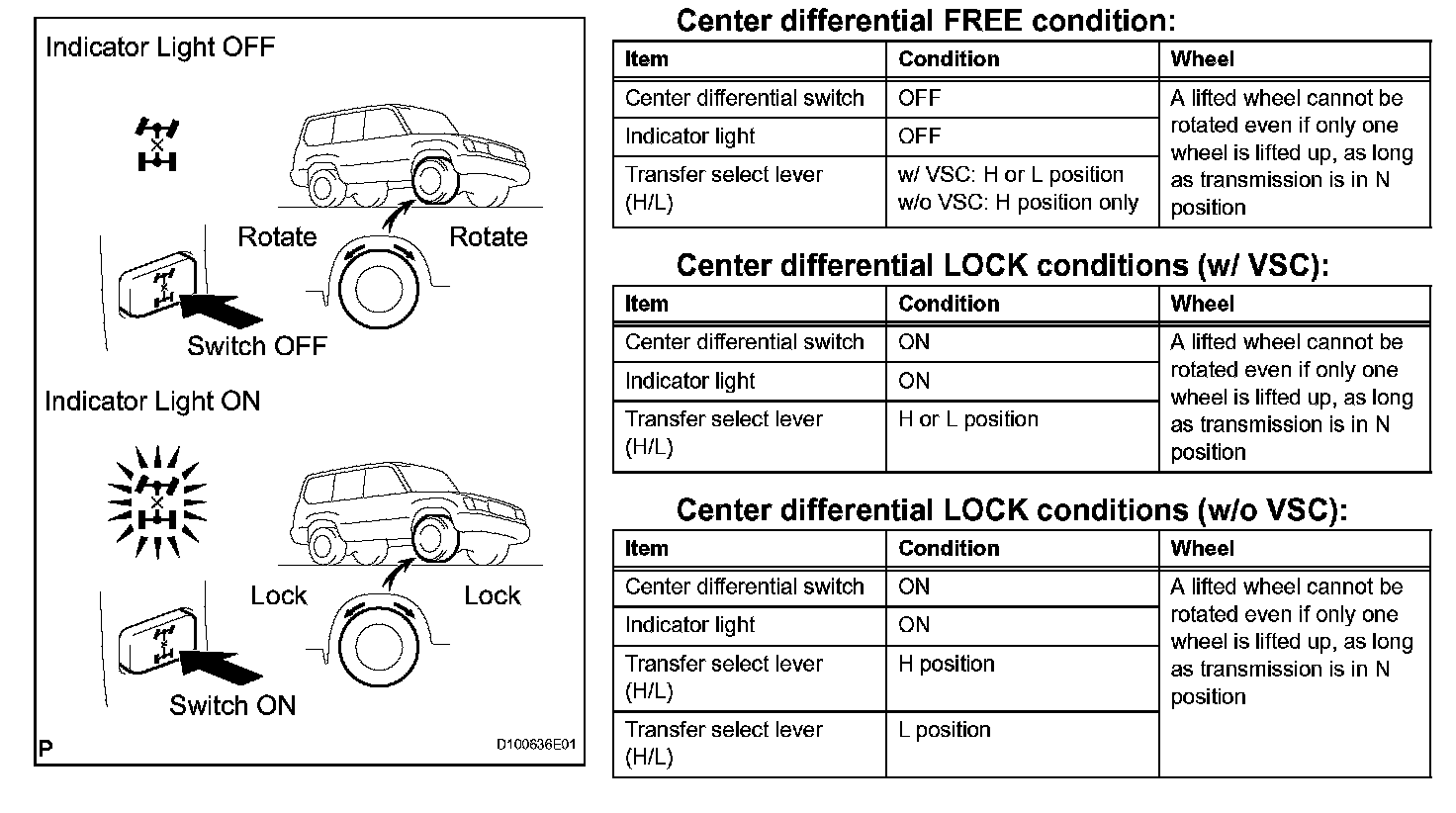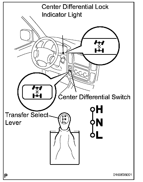 When the transfer select lever is put in the "L" position, the center differential is put in the LOCK condition regardless of the position of the center differential lock switch.