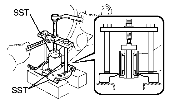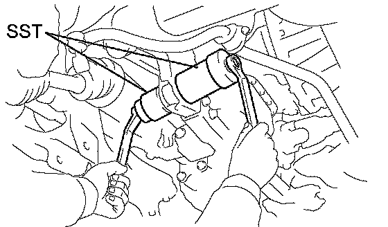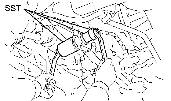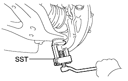 b. Using SST, disconnect the steering knuckle from the lower suspension arm.