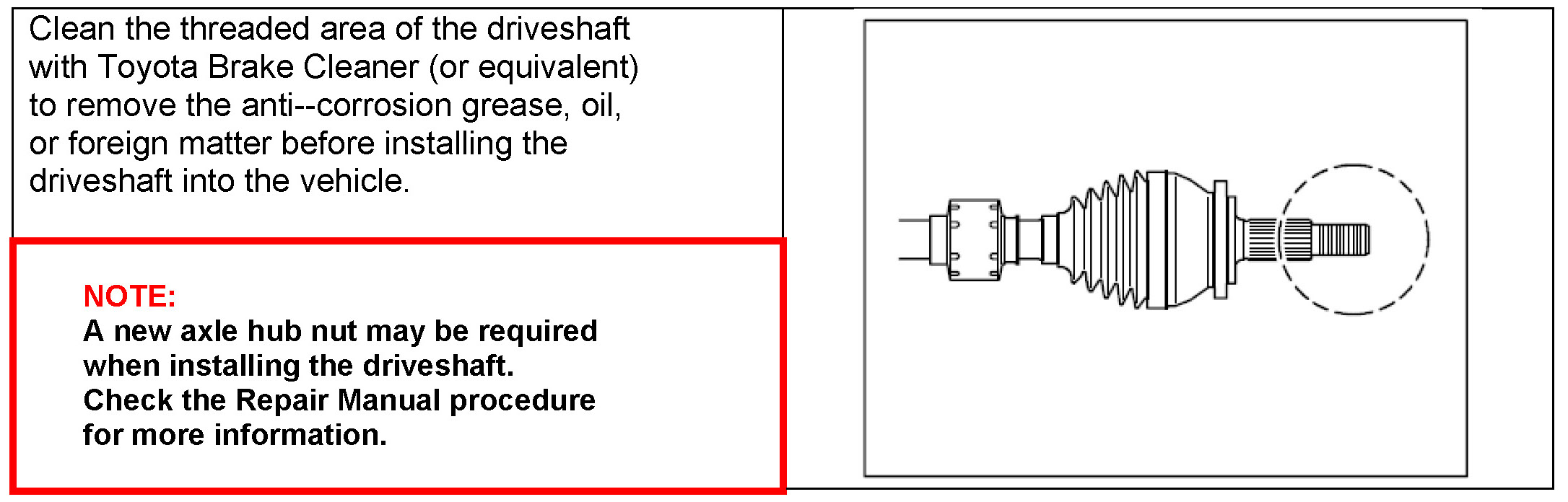 The purpose of this bulletin is to provide information regarding anti-corrosion grease that is present on replacement driveshaft assemblies. It is important to remove this grease prior to installing the hub nut to prevent overtightening.