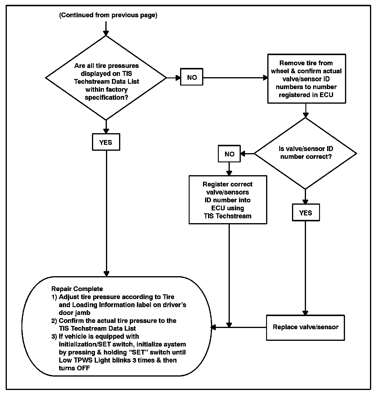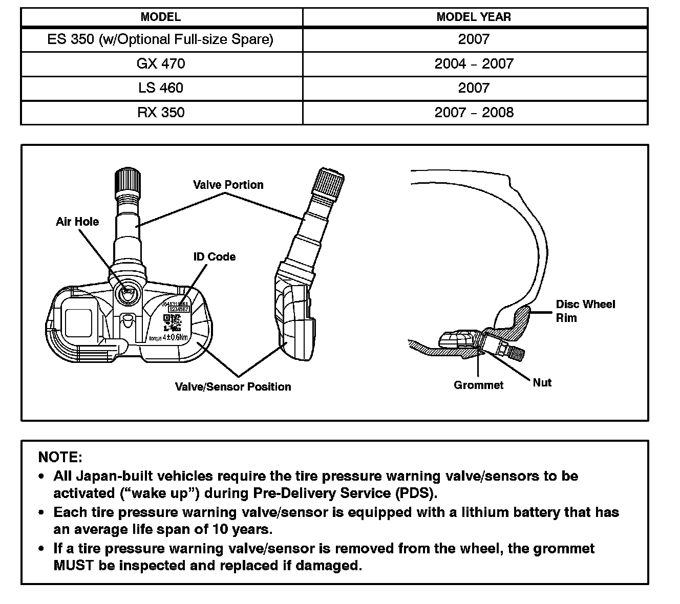 Each wheel (including the spare tire on certain vehicles) has a tire pressure warning valve/sensor integrated into the air valve with a unique ID number that measures the tire pressure and tire temperature and then transmits the information to the antenna/receiver mounted inside the vehicle through a radio wave signal. The unique ID number must be manually entered into the ECU using TIS Techstream whenever the tire pressure warning valve/sensor is replaced or after a tire and wheel are exchanged.