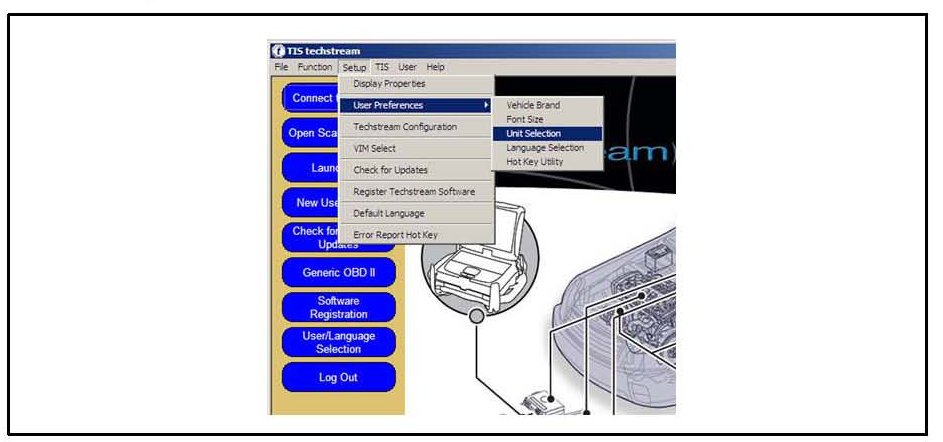 When diagnosing the TPWS with TIS Techstream, it must be set up to read the tire pressures in psi - gauge" (psi - g). Follow the screens below from TIS Techstream to convert the tire pressures to psi - g.