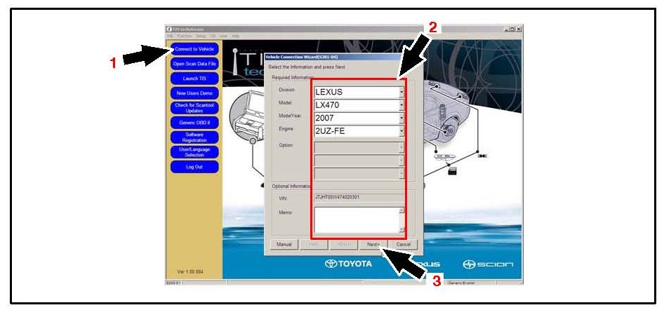 1. Click Connect to Vehicle (refer to "1" in the following screenshot).