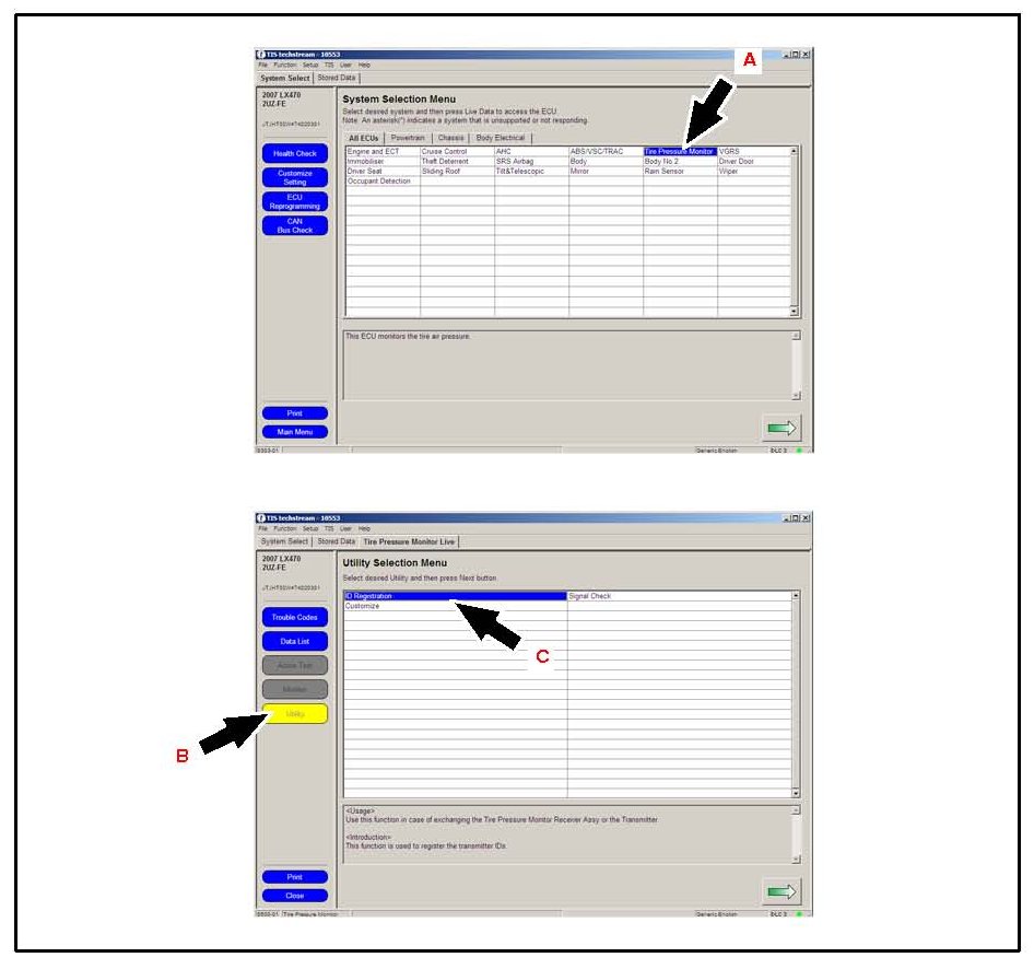 4. Select Tire Pressure Monitor (A) > Utility (B) > ID Registration (C) (refer to the following screenshots).