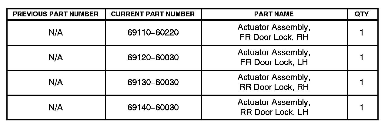 Some 2004 - 2007 model year LX 470 vehicles may experience a condition where the doors do not lock/unlock when using the wireless remotes or the interior power door lock switches. The manual lock/unlock will continue to operate. A separate door lock actuator assembly is now available to address this condition.