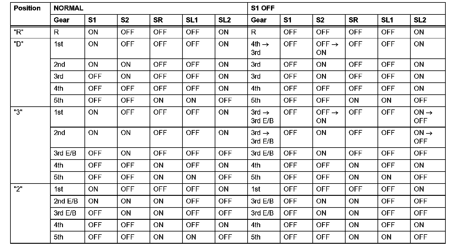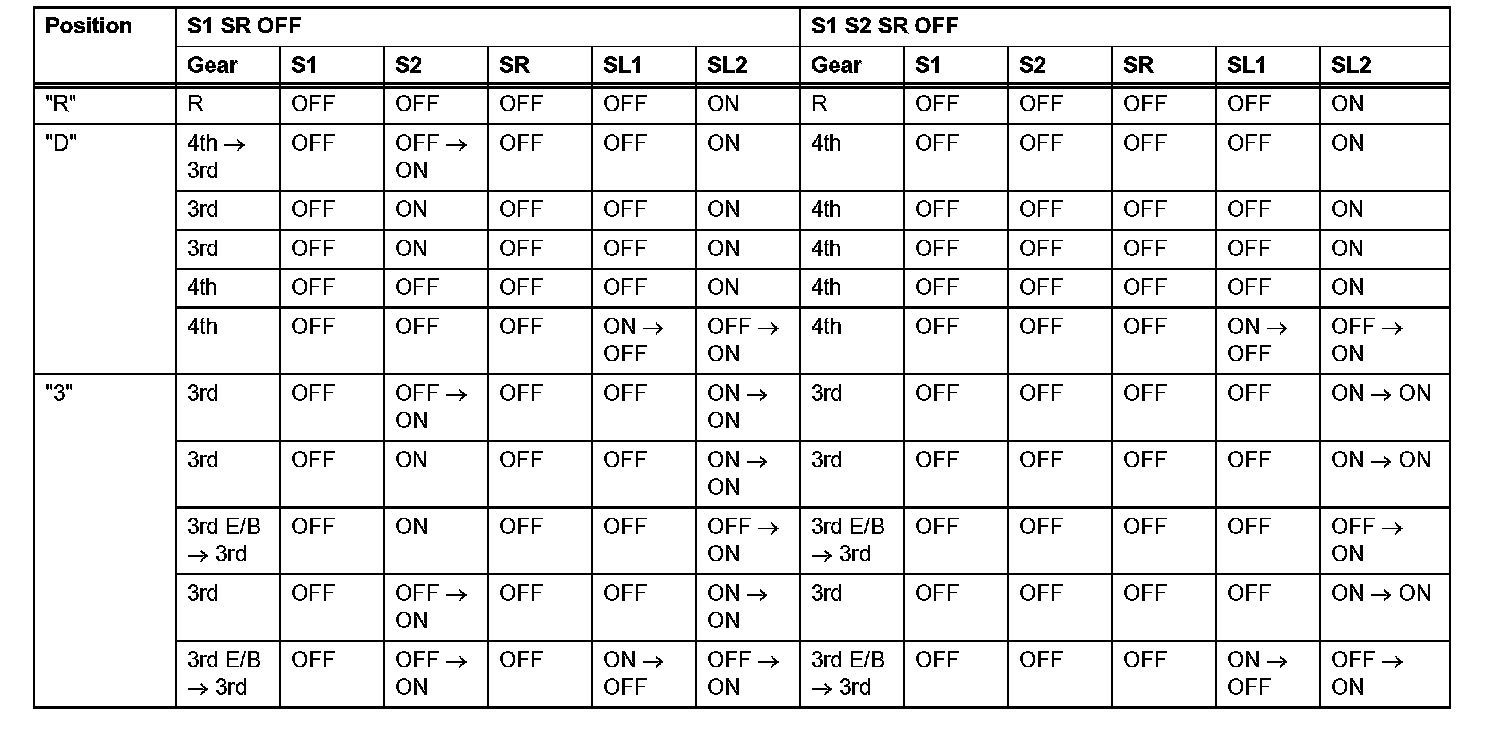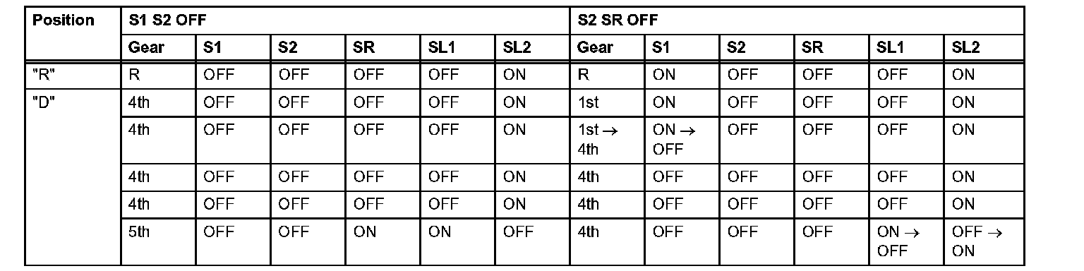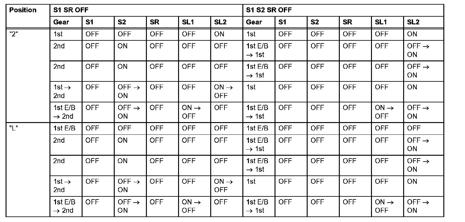 If either of the shift solenoid valve circuits has an open or short failure, the ECM turns the other shift solenoid ON and OFF in order to shift into the gear positions shown in the table.