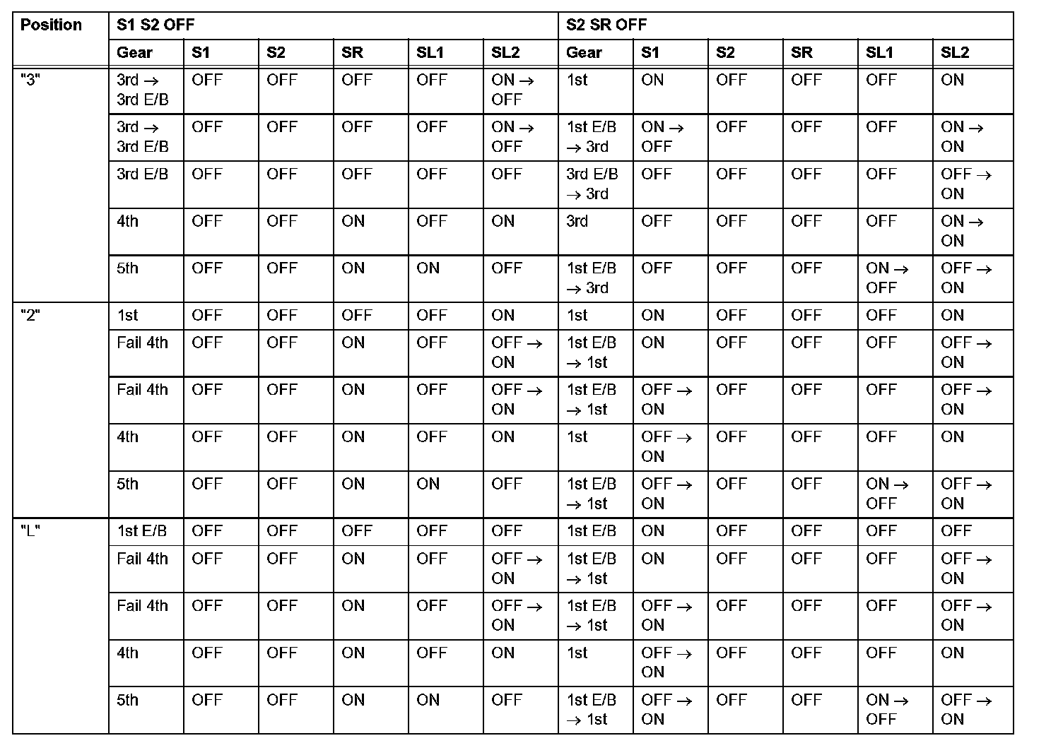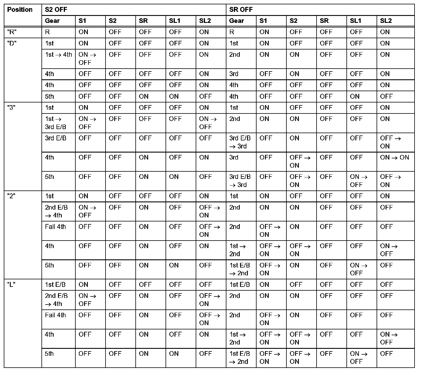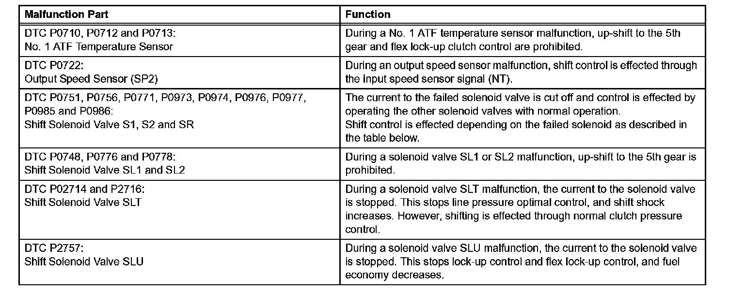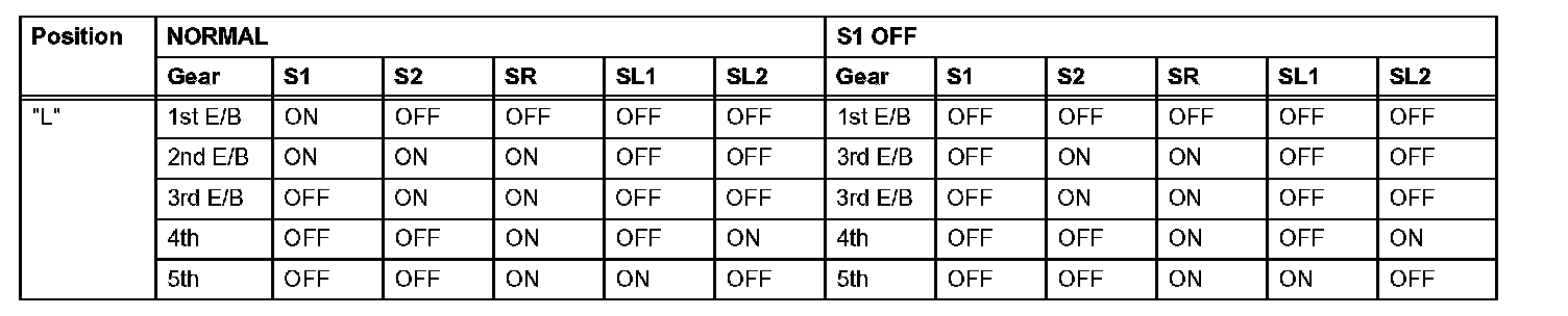 If either of the shift solenoid valve circuits has an open or short failure, the ECM turns the other shift solenoid ON and OFF in order to shift into the gear positions shown in the table.