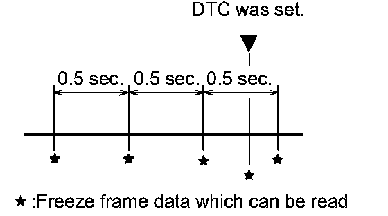 b. The intelligent tester records freeze frame data in five different instances: 1) 3 times before the DTC is set, 2) once when the DTC is set, and 3) once after the DTC is set. These data can be used to simulate the vehicle's condition around the time when the malfunction occurred. The data may help find the cause of the malfunction, or judge if the DTC is being caused by a temporary malfunction or not.