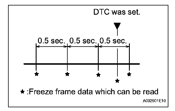 (b) The intelligent tester records freeze frame data in five different instances: 1) 3 times before the DTC is set, 2) once when the DTC is set, and 3) once after the DTC is set. These data can be used to simulate the vehicle's condition around the time when the malfunction occurred. The data may help find the cause of the malfunction, or judge if the DTC is being caused by a temporary malfunction or not.