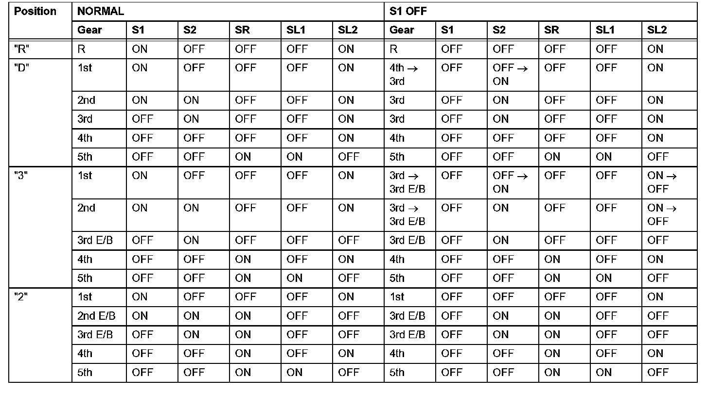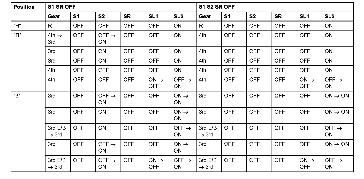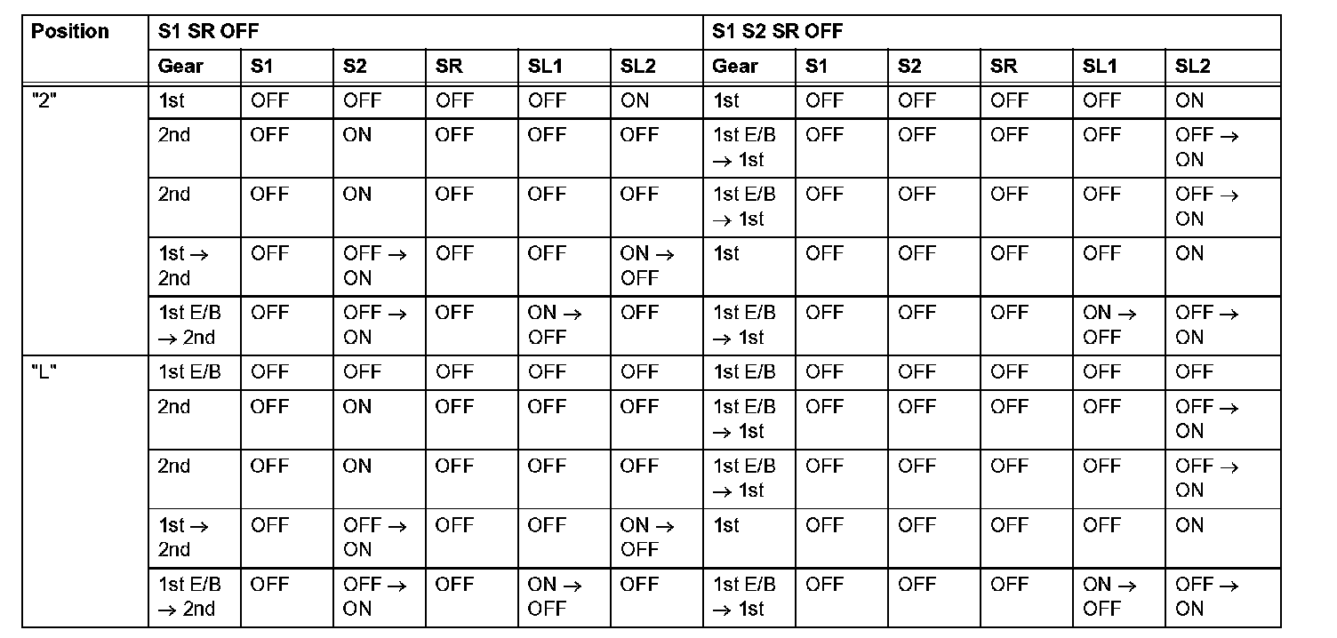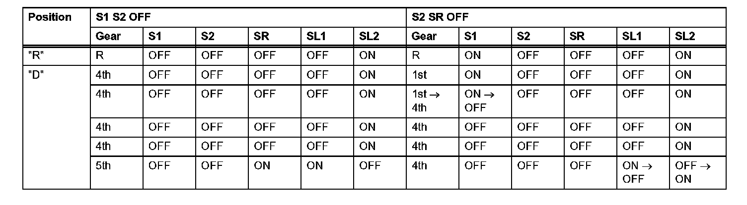 If either of the shift solenoid valve circuits has an open or short failure, the ECM turns the other shift solenoid ON and OFF in order to shift into the gear positions shown in the table.