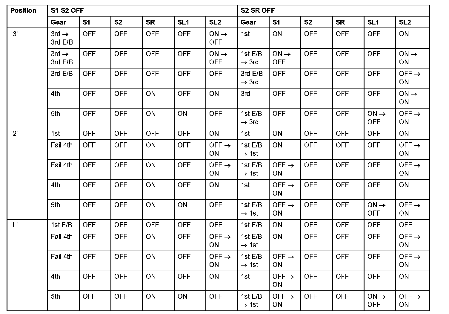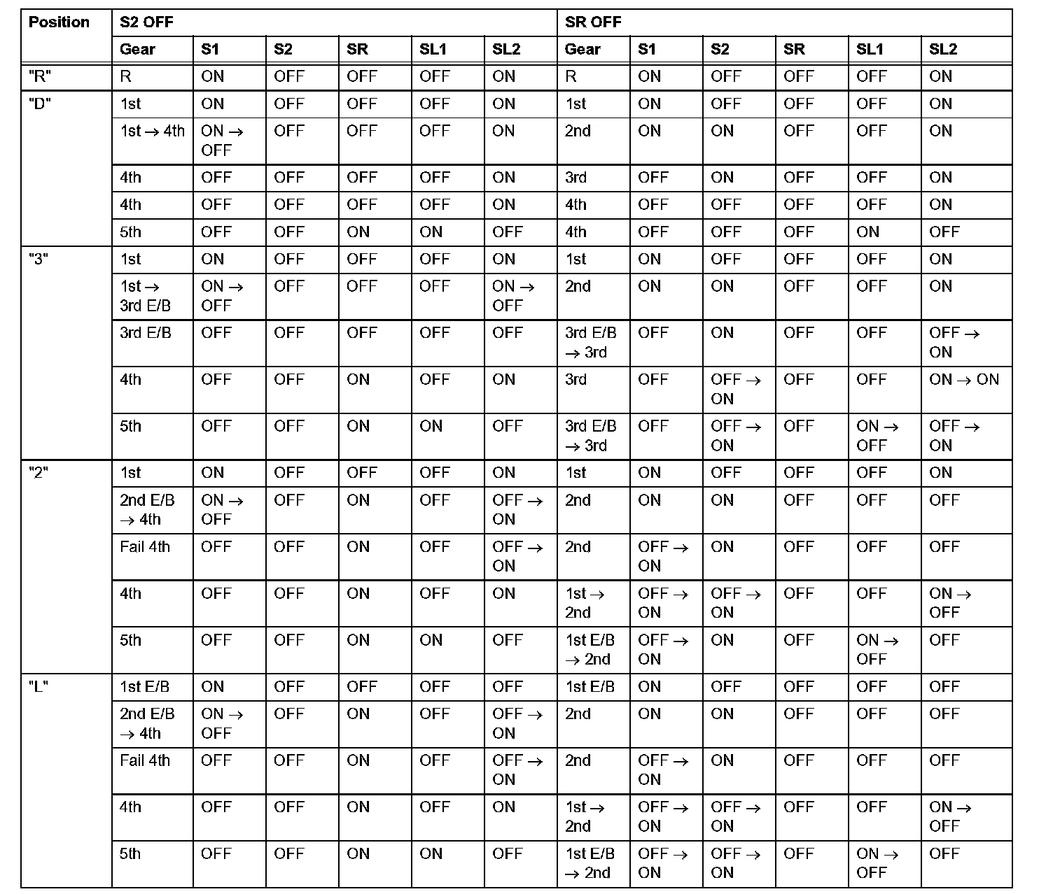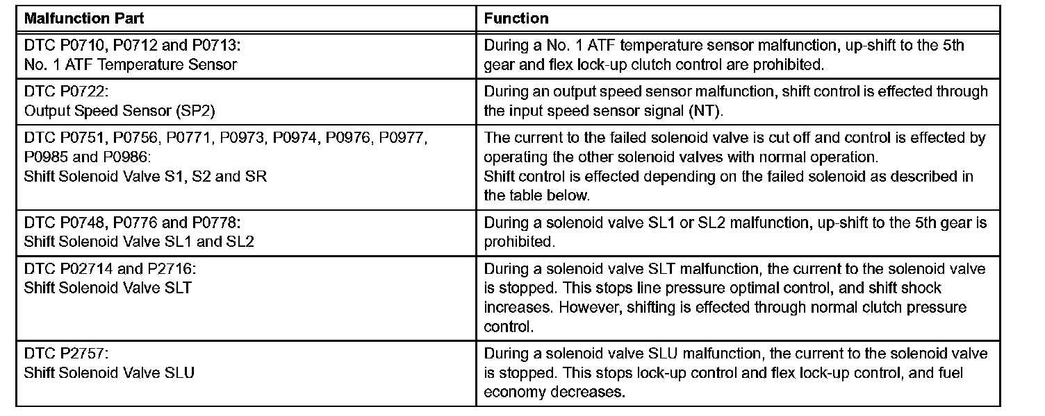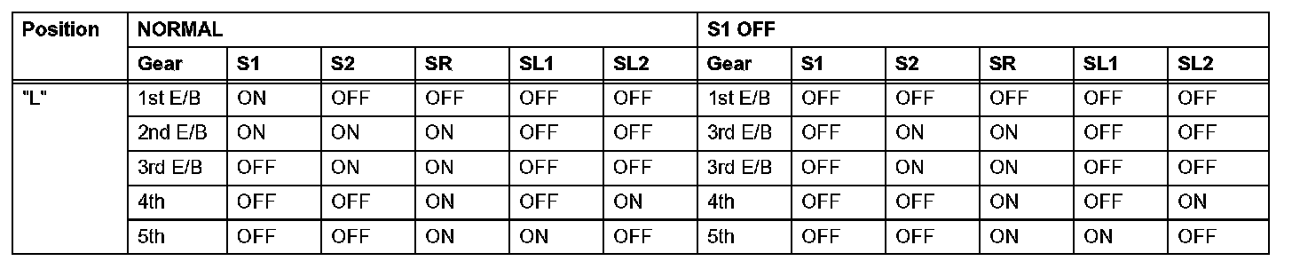 If either of the shift solenoid valve circuits has an open or short failure, the ECM turns the other shift solenoid ON and OFF in order to shift into the gear positions shown in the table.
