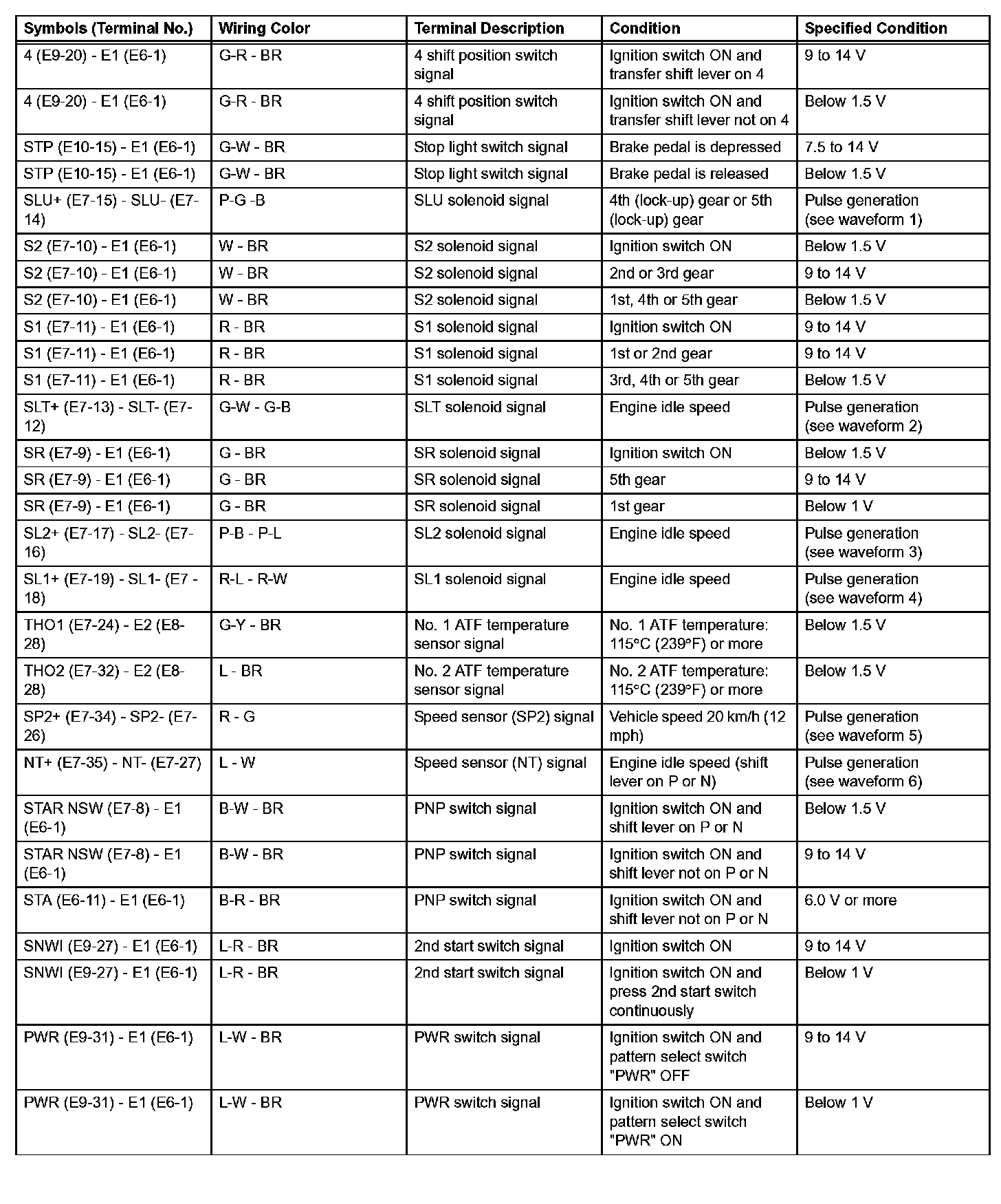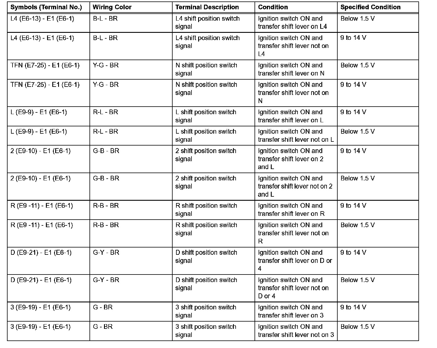 In the table, first follow the information under "Condition". Look under "Symbols (Terminal No.)" for the terminals to be inspected. The standard voltage between the terminals is shown under "Specified Condition".
