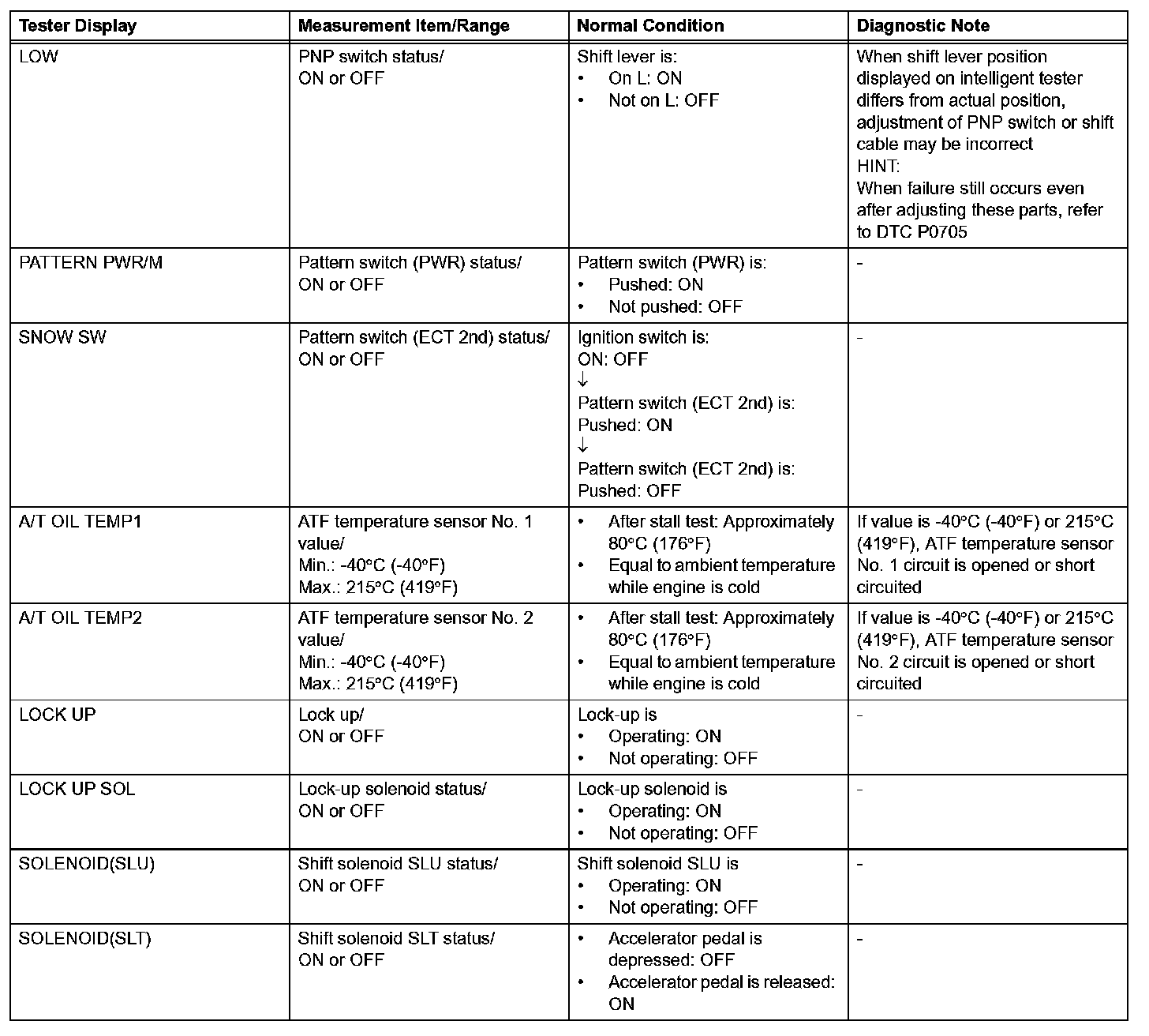HINT: Using the intelligent tester's DATA LIST allows switch, sensor, actuator, and other item values to be read without removing any parts. Reading the DATA LIST early in troubleshooting is one way to save time.