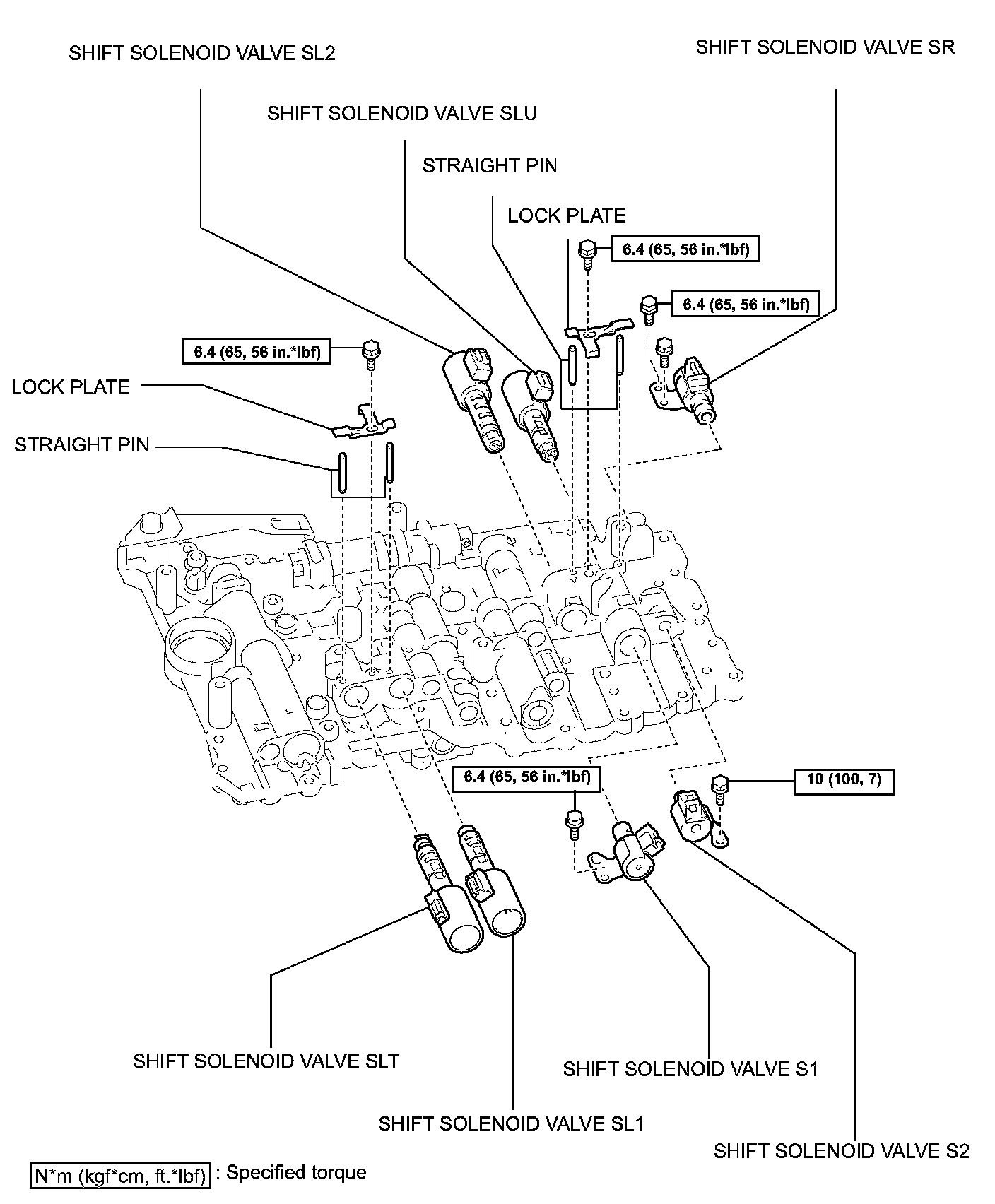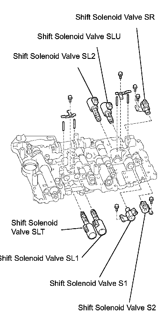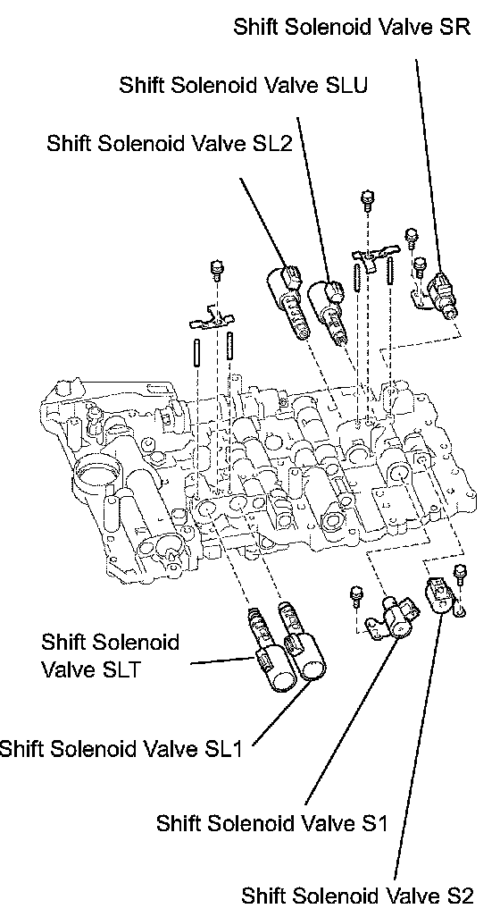 d. Install the shift solenoid valve SLU and SL2 with the 2 pins, lock plate and bolt.