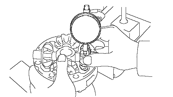 c. Using a dial indicator, measure the side gear backlash while holding one pinion gear toward the differential case.
