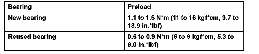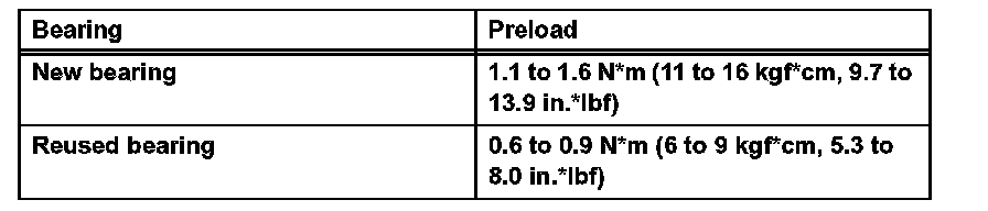 Torque: Standard total preload (at start of torque) 0.4 to 0.6 Nm (4 to 6 kgf-cm, 3.5 to 5.2 inch lbs.) + drive pinion preload