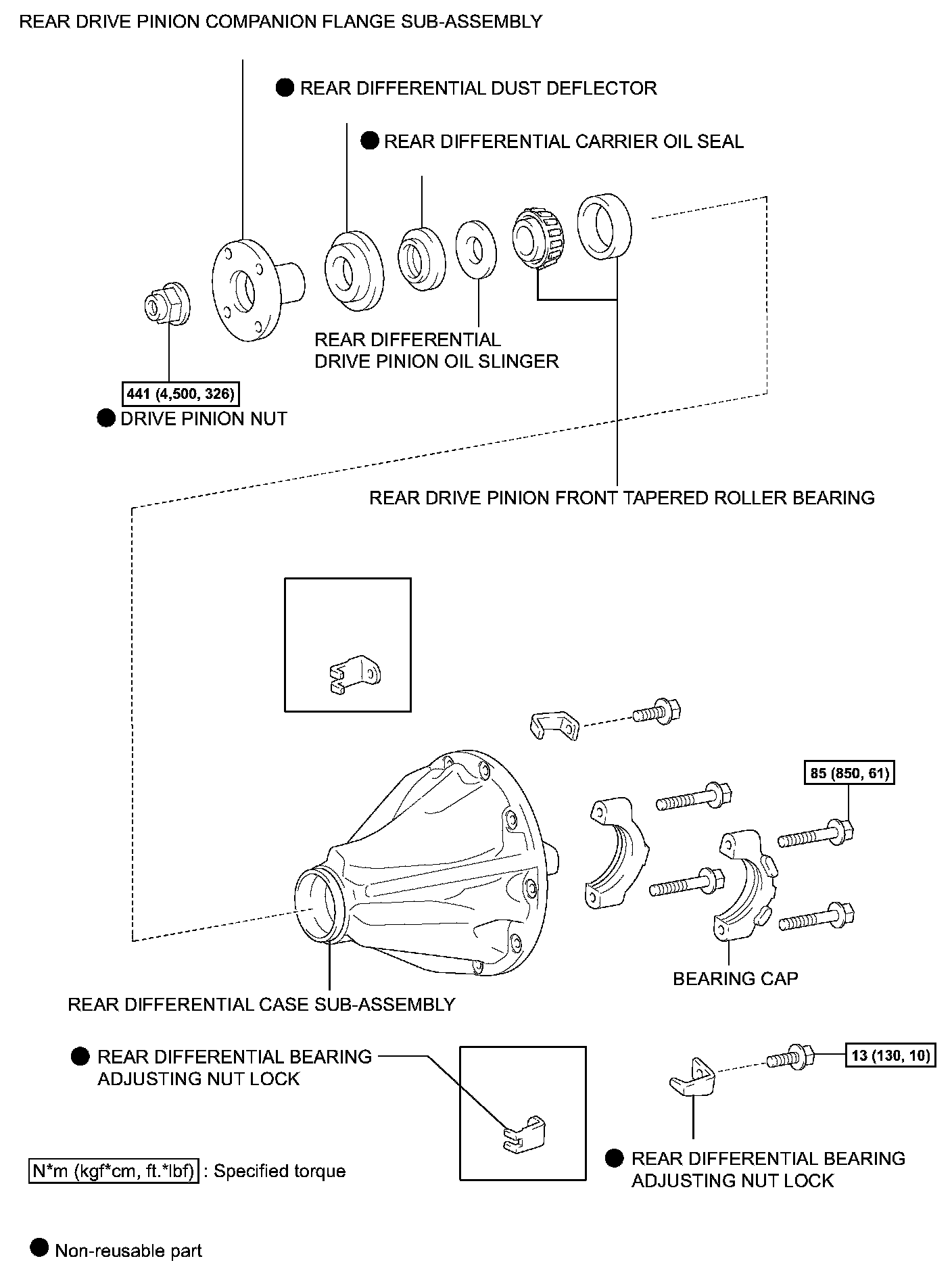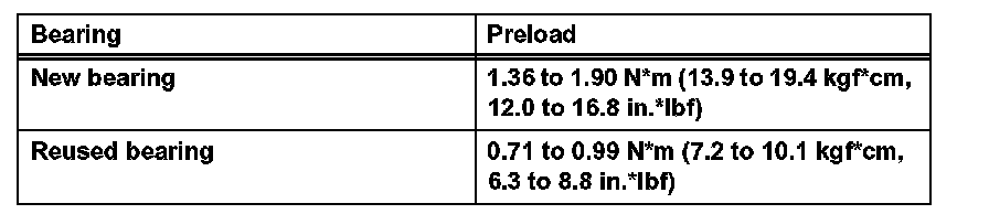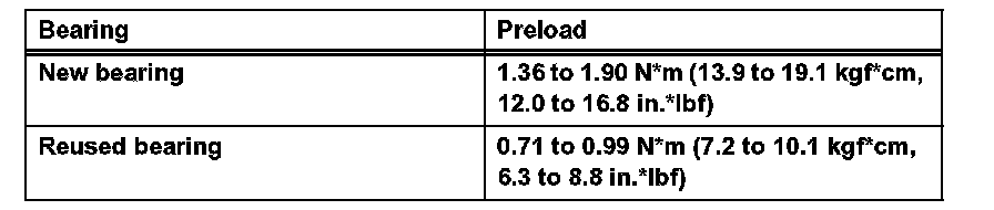 Torque: Standard preload (at start of torque) 0.38 to 0.63 Nm (3.9 to 6.5 kgf-cm, 3.3 to 5.6 inch lbs.) + drive pinion