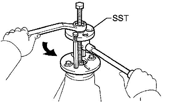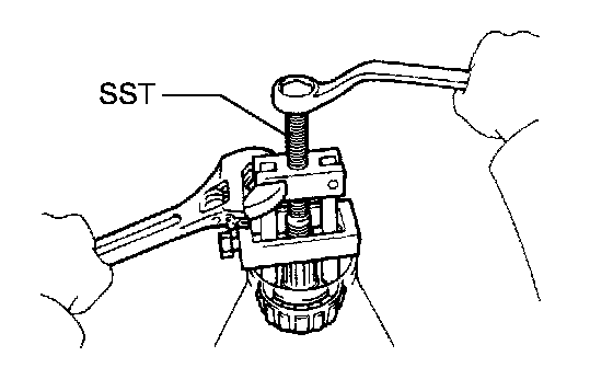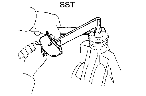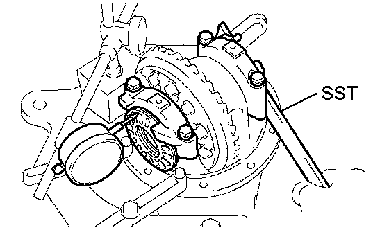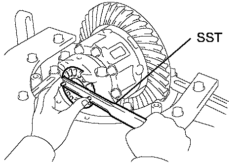 e. While turning the ring gear, use the SST to fully tighten the adjusting nut on the drive pinion side. After the bearings are settled, loosen the adjusting nut on the drive pinion side.