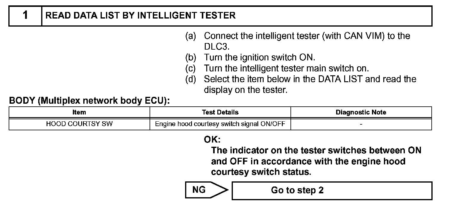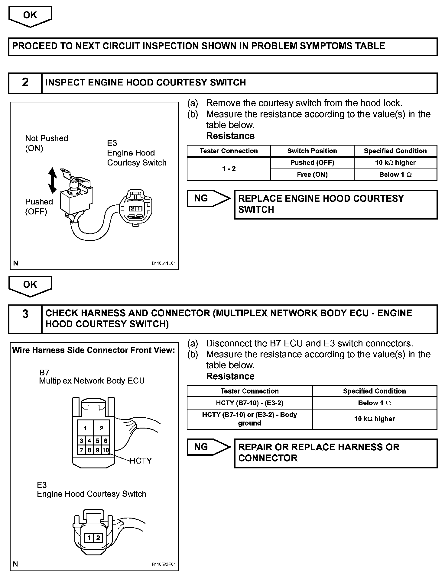 The engine hood courtesy switch is installed together with the hood lock. This switch turns on when the engine hood is opened and turns off when the engine hood is closed.