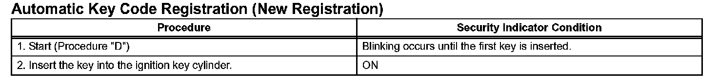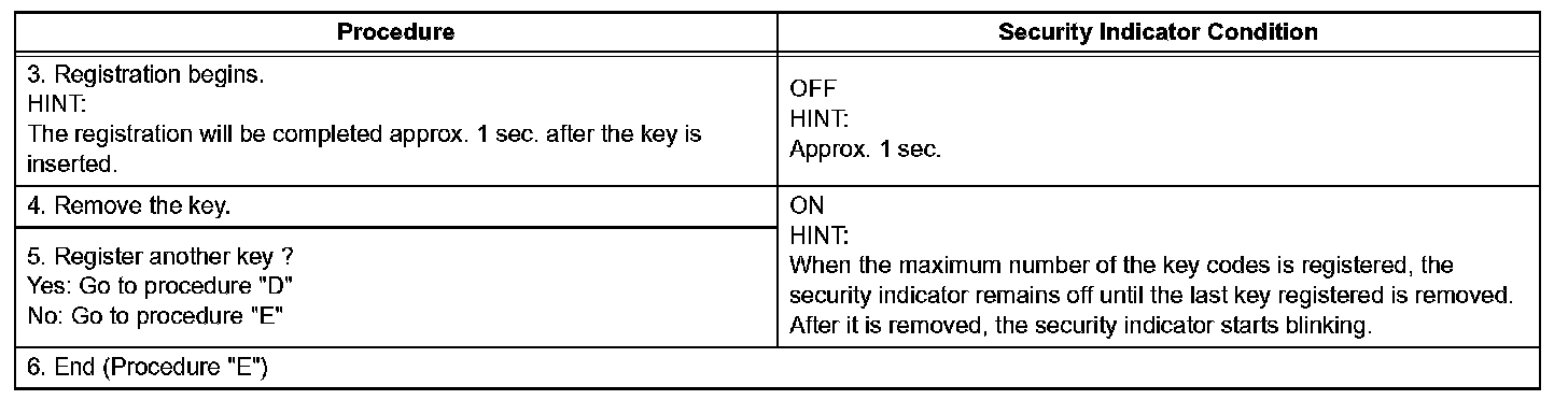 NOTE: If the key code registration has failed in automatic key code registration mode, code 2-1 will be output from the security indicator. Trying to register an already registered key will cause code 2-2 to be output when the key is inserted. If the number of registered key codes exceeds the limit, code 2-3 will be output from the security indicator. The output details are shown in procedure "B".