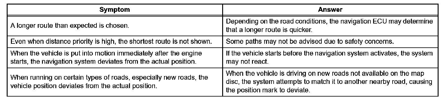 b. The following symptoms are not a malfunction, but are caused by errors inherent in the GPS, gyro sensor, speed sensor, and navigation ECU.